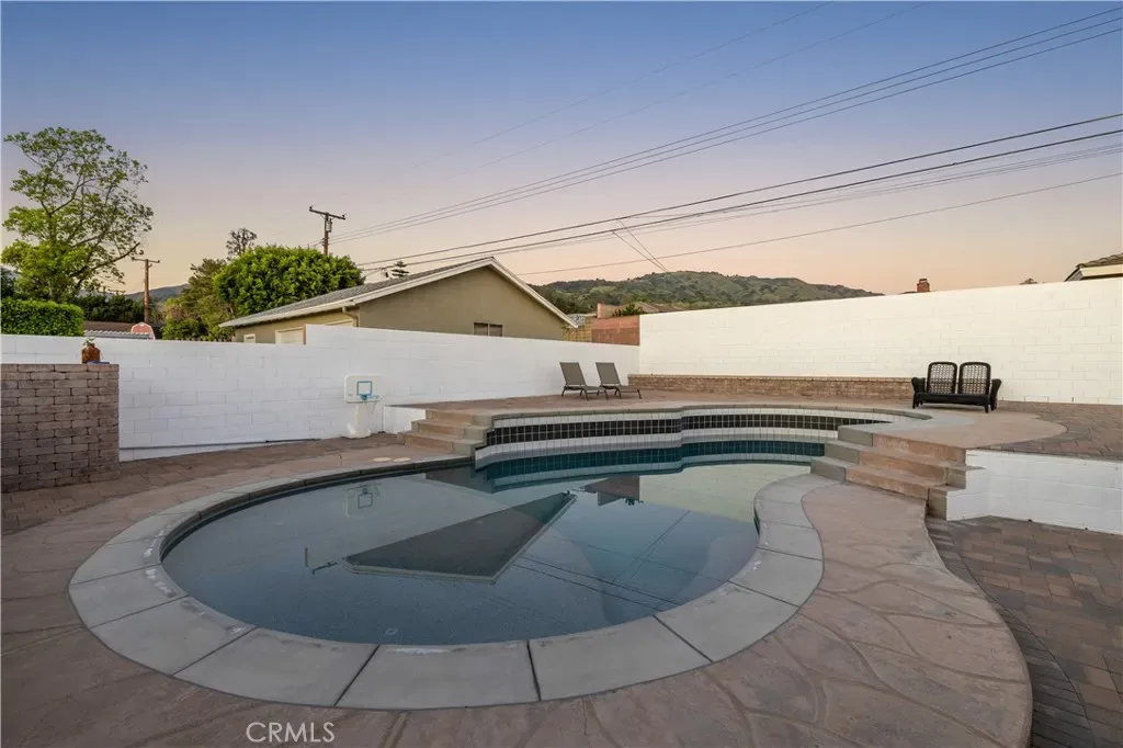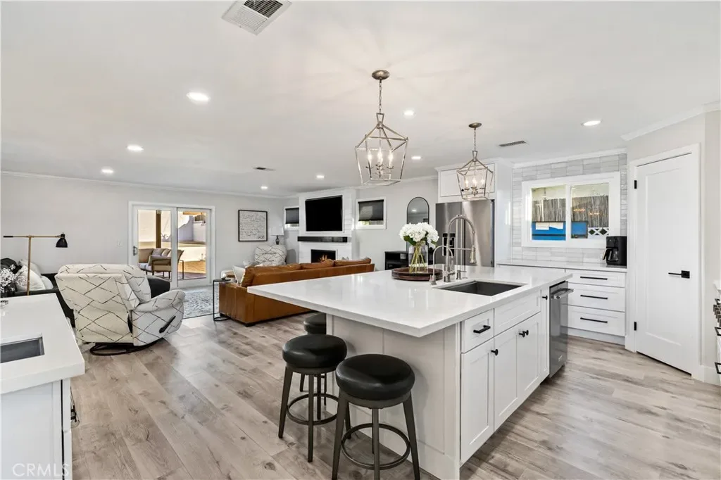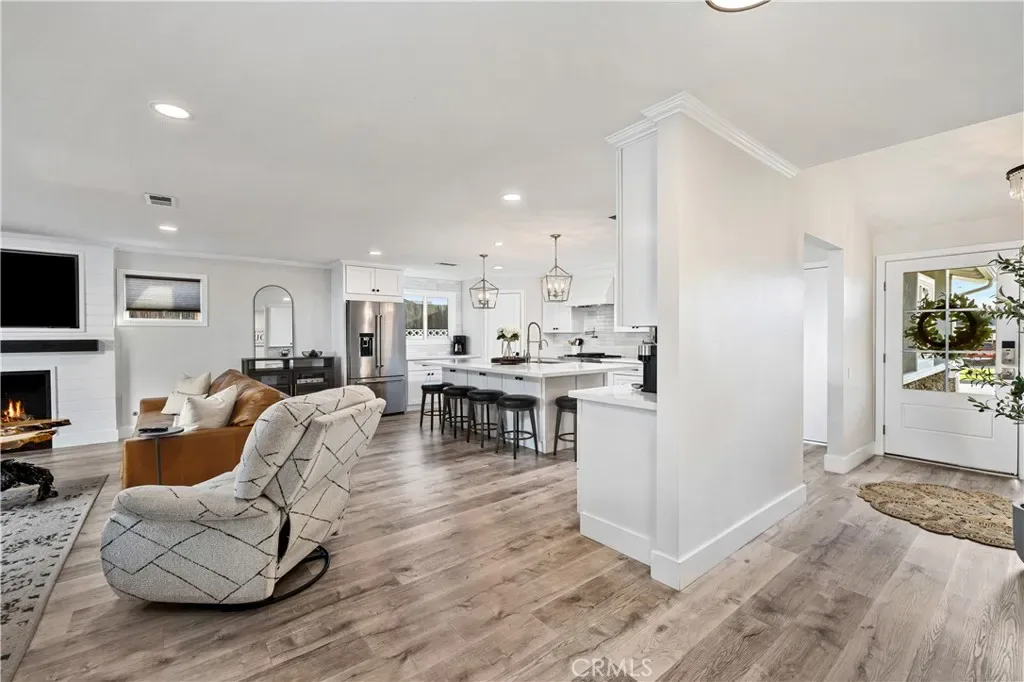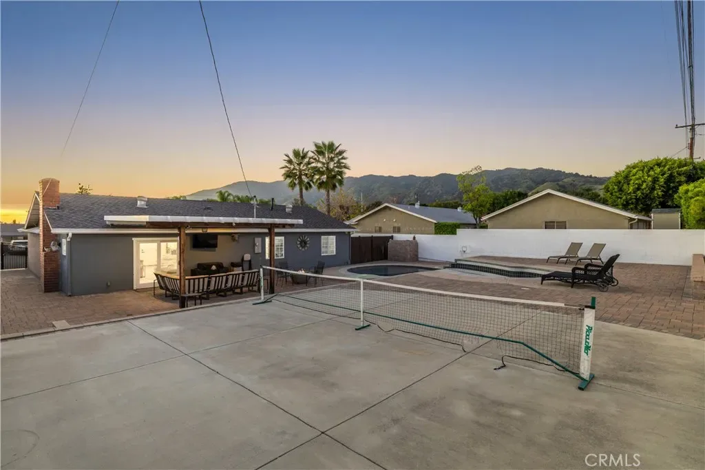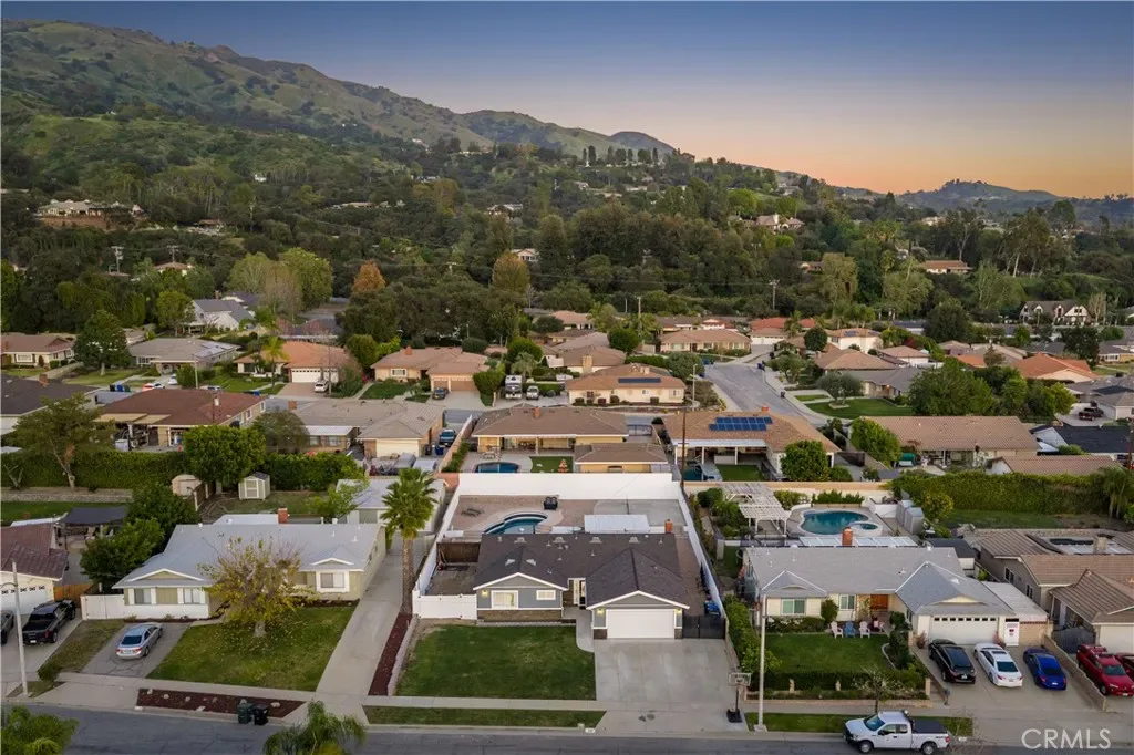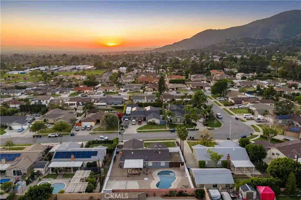 Positioned in a desirable Glendora foothill neighborhood just south of Sierra Madre and within walking distance to Sellers Elementary School, Goddard Middle School, and Glendora High School, this extensively remodeled single-level residence offers an open floor plan, refined finishes, and an expansive lot framed by scenic mountain views. The exterior blends stacked-stone accents and contrasting trim, while a concrete walkway leads to a fiberglass and glass-paneled front door with sidelight opening to a foyer highlighted by crown molding and a shiplap accent wall. The interior opens to a spacious great room anchored by a remodeled kitchen centered around a large island with seating and a sink. White shaker cabinetry, quartz countertops, and a full tile backsplash complement premium appliances including a Bosch gas cooktop, KitchenAid refrigerator, double ovens, and dishwasher. Additional highlights include a coffee bar with a Thermador refrigerator/freezer drawers and an instant hot water dispenser, pendant lighting above the island, recessed lighting, and cabinetry for storage. The kitchen flows seamlessly into the living area where a fireplace with a horizontal mantel creates a focal point and sliding glass doors open to the backyard. The primary suite features recessed lighting and a large window bringing in natural light. A shiplap accent wall adds architectural detail while the en-suite bath includes a dual-sink quartz vanity, framed mirrors, globe lighting, and a glass-enclosed shower with full-height tile and frameless enclosure. A spacious walk-in closet completes the suite. Two additional bedrooms offer windows overlooking the backyard and surrounding foothills, while the hall bathroom includes a dual-sink quartz vanity and glass-enclosed tile shower. A dedicated laundry room provides cabinetry and a utility sink. The backyard is designed for both relaxation and recreation, featuring expansive paver decking surrounding a pebble-finish pool with elevated backsplash, concrete coping, Baja shelf, and three umbrella ports, perfect for entertaining. A covered patio with wood post-and-beam supports and an Alumawood roof provides shaded outdoor living with recessed lighting and a ceiling fan. Multiple terraced areas expand the outdoor space, including an upper sport court ideal for pickleball or basketball. Additional features include gated RV parking with a 240V plug and sewer cleanout, upgraded electrical panel, updated HVAC system, and a 30-year roof.