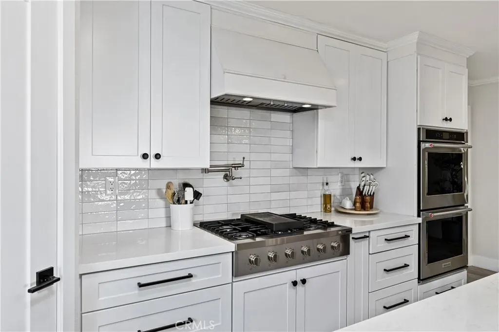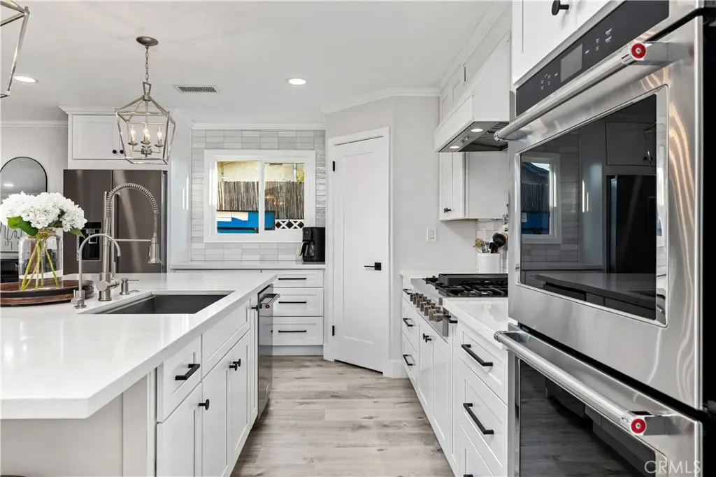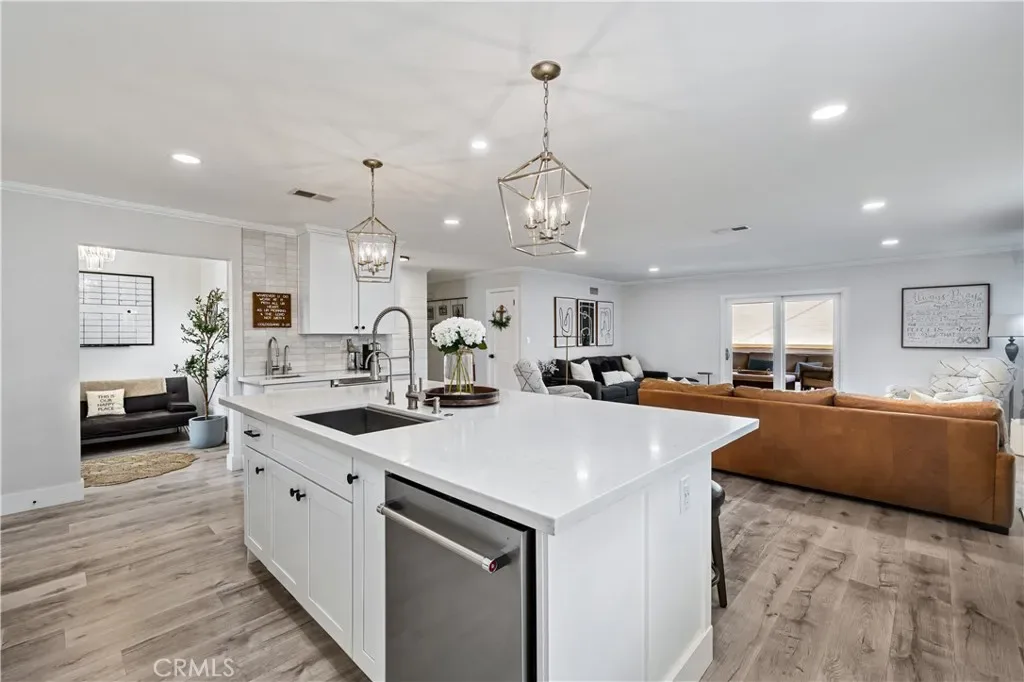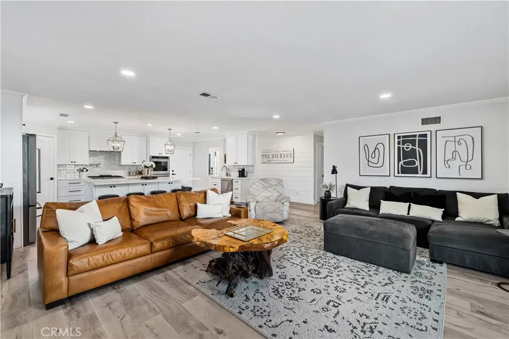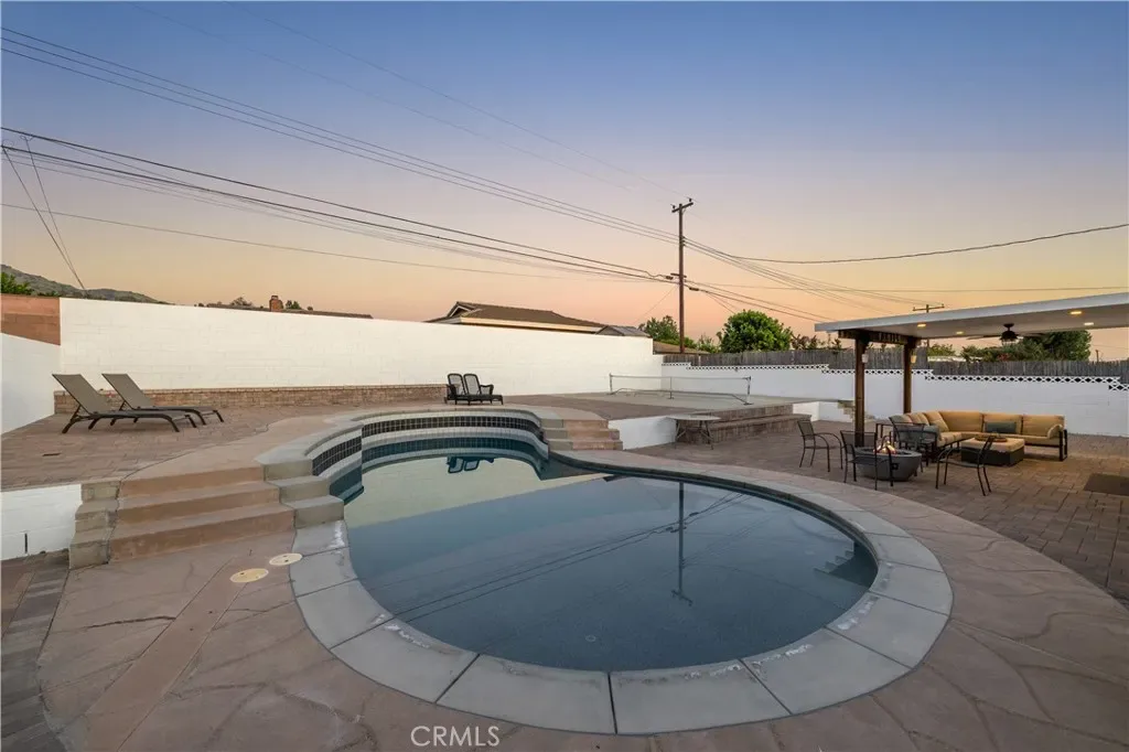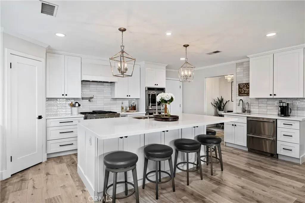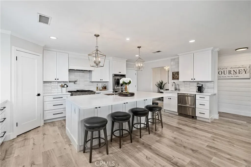 Positioned in a desirable Glendora foothill neighborhood just south of Sierra Madre and within walking distance to Sellers Elementary School, Goddard Middle School, and Glendora High School, this extensively remodeled single-level residence offers an open floor plan, refined finishes, and an expansive lot framed by scenic mountain views. The exterior blends stacked-stone accents and contrasting trim, while a concrete walkway leads to a fiberglass and glass-paneled front door with sidelight opening to a foyer highlighted by crown molding and a shiplap accent wall. The interior opens to a spacious great room anchored by a remodeled kitchen centered around a large island with seating and a sink. White shaker cabinetry, quartz countertops, and a full tile backsplash complement premium appliances including a Bosch gas cooktop, KitchenAid refrigerator, double ovens, and dishwasher. Additional highlights include a coffee bar with a Thermador refrigerator/freezer drawers and an instant hot water dispenser, pendant lighting above the island, recessed lighting, and cabinetry for storage. The kitchen flows seamlessly into the living area where a fireplace with a horizontal mantel creates a focal point and sliding glass doors open to the backyard. The primary suite features recessed lighting and a large window bringing in natural light. A shiplap accent wall adds architectural detail while the en-suite bath includes a dual-sink quartz vanity, framed mirrors, globe lighting, and a glass-enclosed shower with full-height tile and frameless enclosure. A spacious walk-in closet completes the suite. Two additional bedrooms offer windows overlooking the backyard and surrounding foothills, while the hall bathroom includes a dual-sink quartz vanity and glass-enclosed tile shower. A dedicated laundry room provides cabinetry and a utility sink. The backyard is designed for both relaxation and recreation, featuring expansive paver decking surrounding a pebble-finish pool with elevated backsplash, concrete coping, Baja shelf, and three umbrella ports, perfect for entertaining. A covered patio with wood post-and-beam supports and an Alumawood roof provides shaded outdoor living with recessed lighting and a ceiling fan. Multiple terraced areas expand the outdoor space, including an upper sport court ideal for pickleball or basketball. Additional features include gated RV parking with a 240V plug and sewer cleanout, upgraded electrical panel, updated HVAC system, and a 30-year roof.