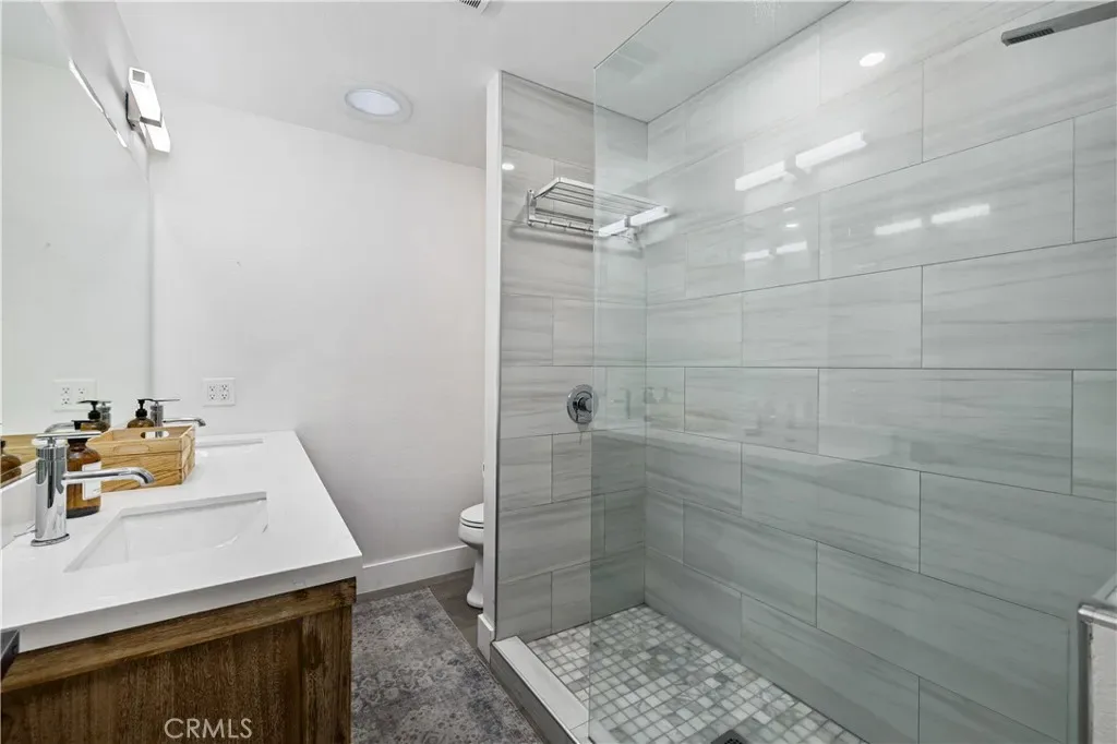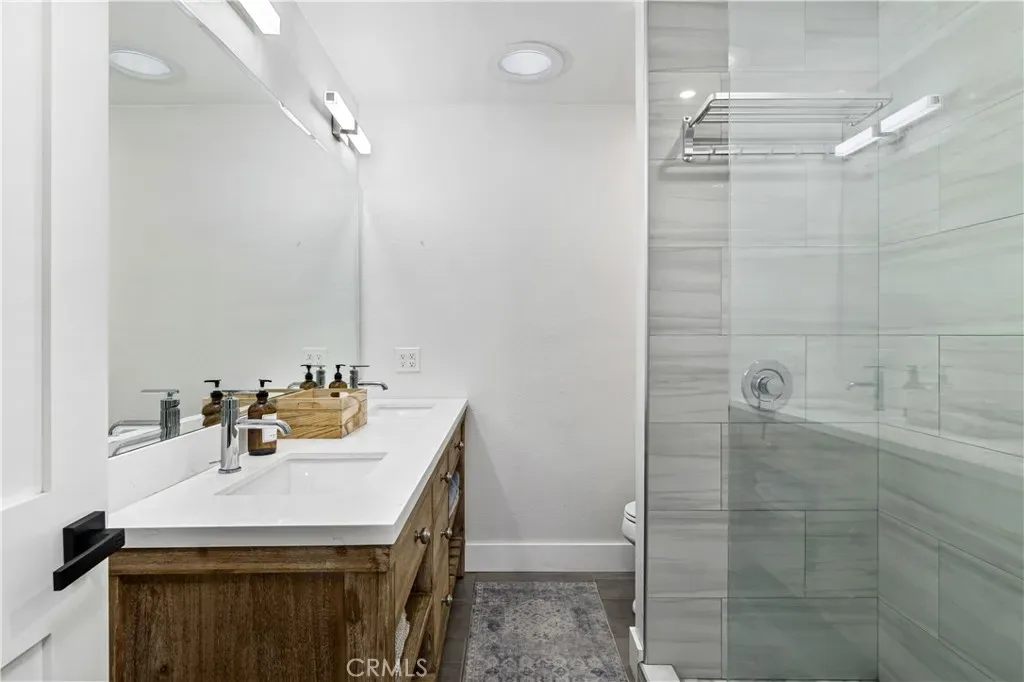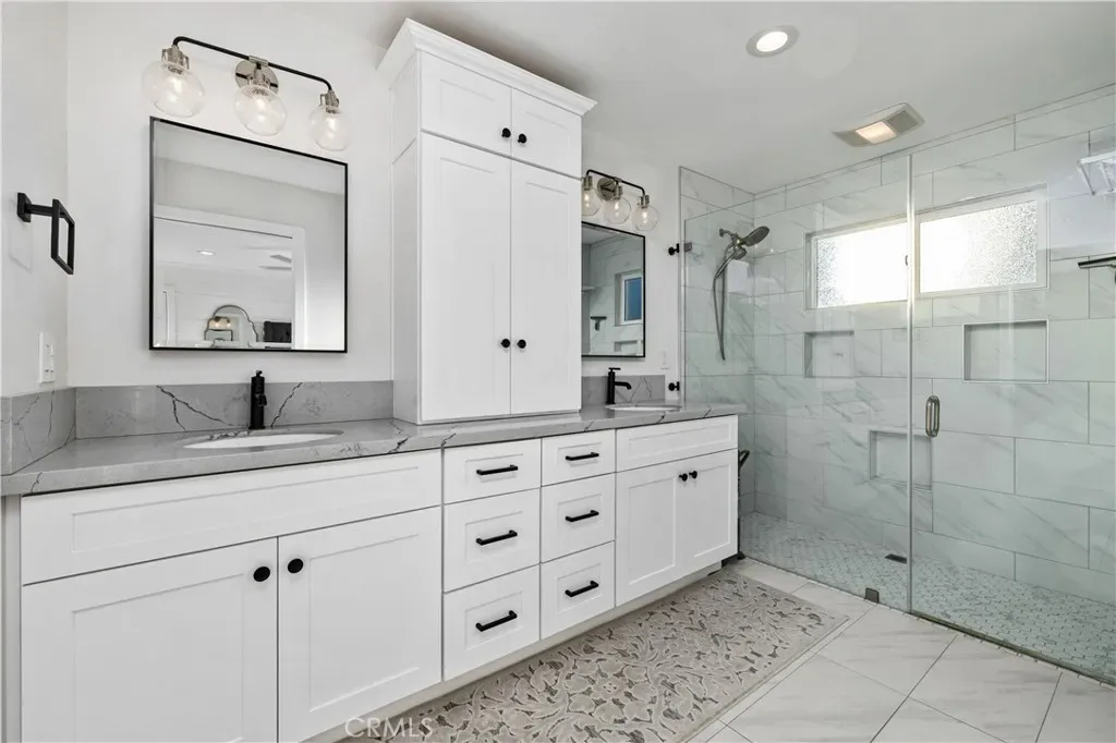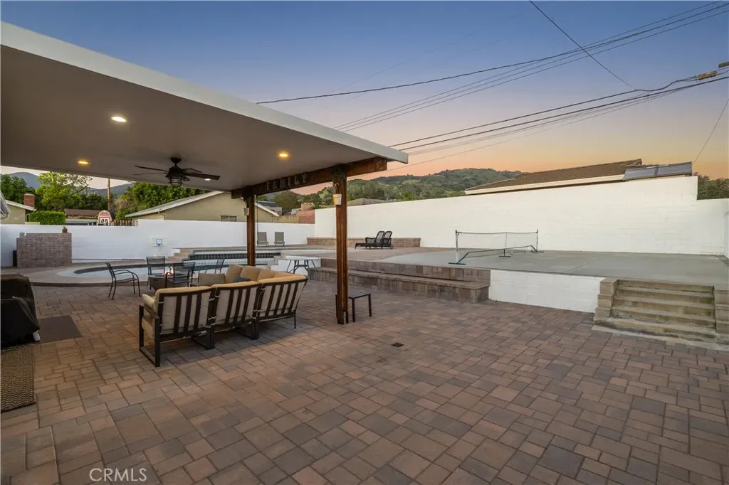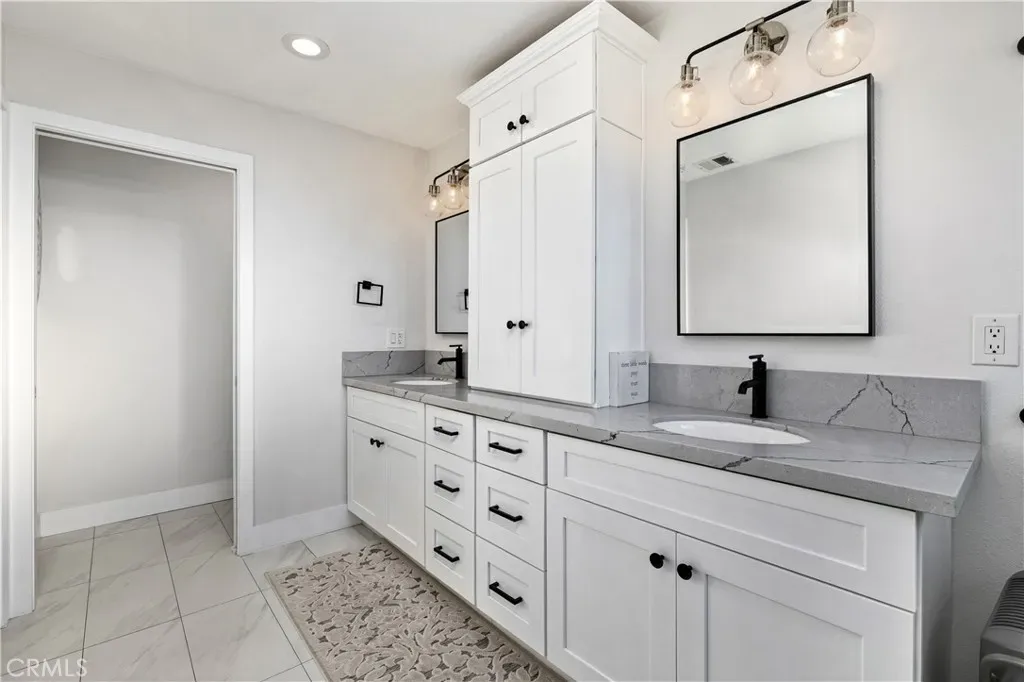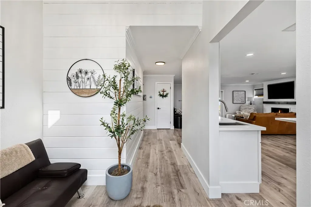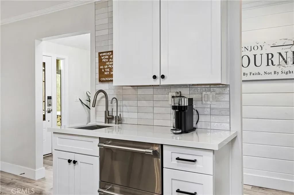 Positioned in a desirable Glendora foothill neighborhood just south of Sierra Madre and within walking distance to Sellers Elementary School, Goddard Middle School, and Glendora High School, this extensively remodeled single-level residence offers an open floor plan, refined finishes, and an expansive lot framed by scenic mountain views. The exterior blends stacked-stone accents and contrasting trim, while a concrete walkway leads to a fiberglass and glass-paneled front door with sidelight opening to a foyer highlighted by crown molding and a shiplap accent wall. The interior opens to a spacious great room anchored by a remodeled kitchen centered around a large island with seating and a sink. White shaker cabinetry, quartz countertops, and a full tile backsplash complement premium appliances including a Bosch gas cooktop, KitchenAid refrigerator, double ovens, and dishwasher. Additional highlights include a coffee bar with a Thermador refrigerator/freezer drawers and an instant hot water dispenser, pendant lighting above the island, recessed lighting, and cabinetry for storage. The kitchen flows seamlessly into the living area where a fireplace with a horizontal mantel creates a focal point and sliding glass doors open to the backyard. The primary suite features recessed lighting and a large window bringing in natural light. A shiplap accent wall adds architectural detail while the en-suite bath includes a dual-sink quartz vanity, framed mirrors, globe lighting, and a glass-enclosed shower with full-height tile and frameless enclosure. A spacious walk-in closet completes the suite. Two additional bedrooms offer windows overlooking the backyard and surrounding foothills, while the hall bathroom includes a dual-sink quartz vanity and glass-enclosed tile shower. A dedicated laundry room provides cabinetry and a utility sink. The backyard is designed for both relaxation and recreation, featuring expansive paver decking surrounding a pebble-finish pool with elevated backsplash, concrete coping, Baja shelf, and three umbrella ports, perfect for entertaining. A covered patio with wood post-and-beam supports and an Alumawood roof provides shaded outdoor living with recessed lighting and a ceiling fan. Multiple terraced areas expand the outdoor space, including an upper sport court ideal for pickleball or basketball. Additional features include gated RV parking with a 240V plug and sewer cleanout, upgraded electrical panel, updated HVAC system, and a 30-year roof.