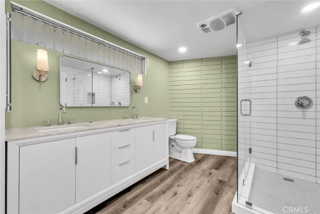Large primary suite with newly remodeled bathroom featuring a dual-sink vanity, subway tile shower with custom glass walls, and a dressing area with double closets;