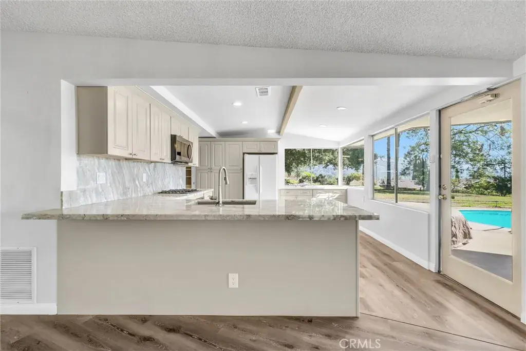 Kitchen opens to a spacious family room with vaulted wood-beam ceilings, new vinyl plank flooring, and a dramatic stone fireplace;