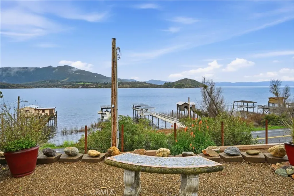 If you are looking for a permanent home or a getaway with the most spectacular 180 degree panoramic views and sunsets of beautiful Clearlake, well you have found it. This 3 bedroom, 2 bath home has recently been updated to include new inside paint, ductless mini-split ac & heat (think low PG&E), new dishwasher and refrigerator, new ceiling fan lights and new rain gutters w/leaf filters and downspouts. The main level of this home features 960 sq. ft. with 2 bedrooms and 1 bath with an open living room/dining room and kitchen with Quartz countertops/island leading to a 25’x 10′ covered deck overlooking beautiful Clearlake. The lower level includes 516 sq. ft. with 1 bedroom, 1 bath, living room(currently used as a 2nd bedroom), kitchenette, mini split heat/air also with those great views. Both front and back yards are landscaped for minimal upkeep and are both fenced for your furry friends, Top it off with a 75’ pier and a covered boat lift for your pontoon or bass boat on one of the best bass fishing lakes in California and you have it all!