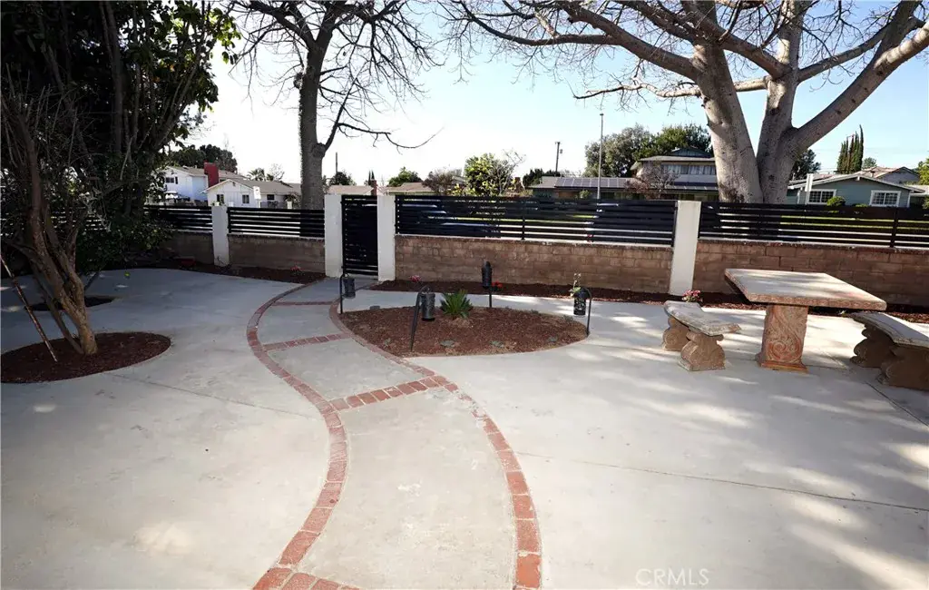 Before entering the home, you pass through a gated entry that leads into a private front yard and a sitting area with mature trees, landscaped grounds, creating a calm and inviting outdoor space.
