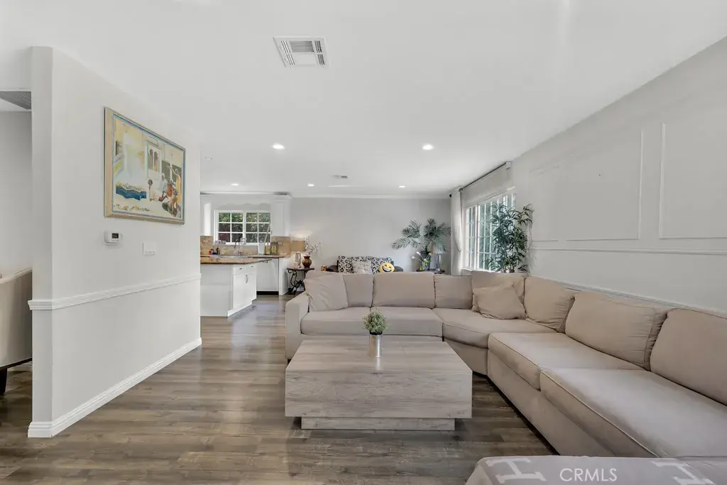 Welcome to this rare, beautifully designed single-story home nestled in one of Granada Hills’ most desirable neighborhoods. Situated on a 0.25-acre lot, this 4-bedroom, 2.5-bathroom residence offers 1,956 square feet of living space and was fully gutted and reimagined with a modern floor plan less than 10 years ago. Step inside to wood-like flooring and recessed lighting throughout the home. The formal foyer features a guest half-bath, a storage closet, and wainscoting that continues through both the foyer hallway and the guest bedroom hallway, adding consistent architectural detail. Down the entry hall, the formal dining area includes classic chair-rail wainscoting and flows into the open-concept living room. The living room is bright and spacious, featuring custom built-in cabinetry and a decorative picture-frame panel molding accent wall. The living room is bright, spacious, and thoughtfully designed for both everyday living and entertaining, featuring custom built-in cabinetry and a decorative picture-frame panel molding accent wall, creating a refined yet inviting atmosphere filled with natural light. The chef’s kitchen offers beautiful natural granite countertops with ample counter space, a large center island, stainless farmhouse apron sink, top-to-bottom tile backsplash, generous cabinetry, and quality appliances. The primary suite features 14-foot vaulted ceilings, a walk-in closet with custom built-ins, and an ensuite bathroom boasting beautiful tile work throughout and a walk-in shower. Three additional well-sized bedrooms offer ample closet space and share a full hallway bathroom with a shower/tub combination, also highlighted by elegant tile finishes. The backyard includes a large patio with a fire pit, built-in BBQ, wood pergola, and views of the San Gabriel Mountains. The remaining flat yard offers excellent potential for an ADU, pool, or garden and is adorned with a variety of fruit-bearing plants, including multiple citrus trees such as orange, lemon, and pear, as well as an apricot tree, apple tree, olive tree, and a grapevine. The front yard features a fig tree, a berry plant, and another apricot tree. Located at 11962 Salem Drive, this home enjoys close proximity to Knollwood Country Club, nearby hiking and nature trails, and the Granada Hills Town Center & Village, offering shopping, dining, and community events. This is a truly special opportunity to own a turnkey home in an exceptional Granada Hills location—don’t miss out.