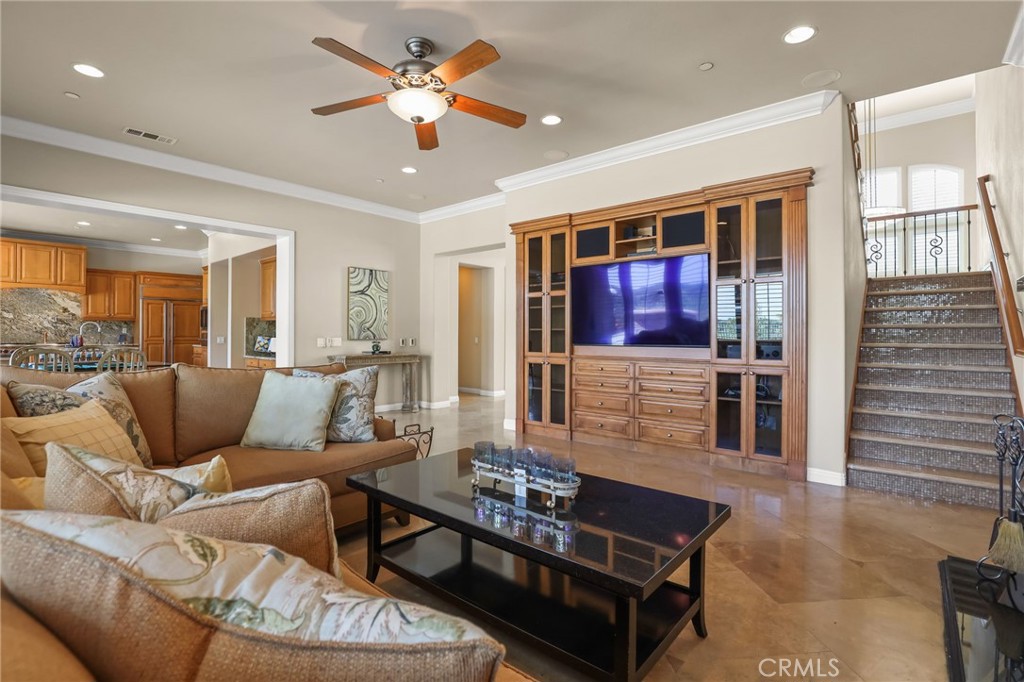 Step inside to rich architectural detail: travertine floors, plantation shutters, bespoke cabinetry, custom crown molding, and three fireplaces (including wood-burning for warmth and ambiance). The home is an entertainer’s dream with a striking built-in aquarium, wet bar, surround sound, intercom, custom entertainment centers, and a spacious upper-level lounge with balcony—perfect as a media/game room while soaking in the panoramic backdrop.