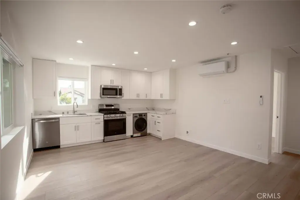 The interior showcases a bright, open layout with white kitchen cabinetry, modern appliances, recessed lighting, and light wood-tone flooring throughout. The bedroom includes mirrored closet doors, while the spa-inspired bathroom features a sleek, contemporary shower design. A brand new all-in-one washer/dryer inside for added convenience. Attic access via ceiling hatch with pull-down stairs, offering a spacious, lighted storage area.