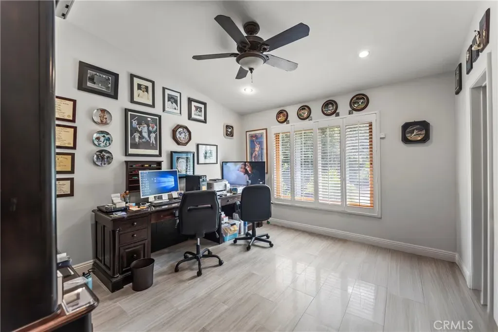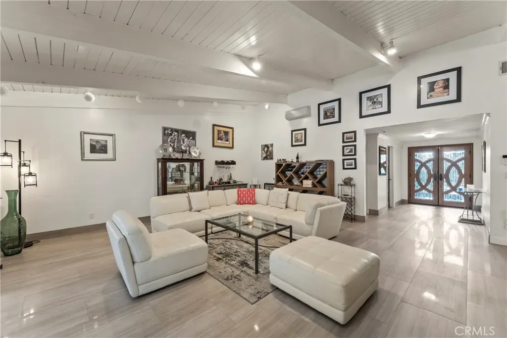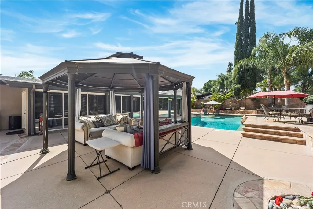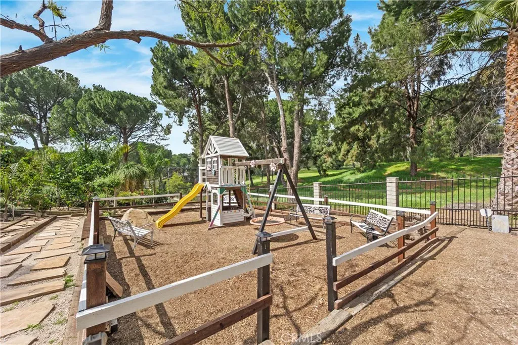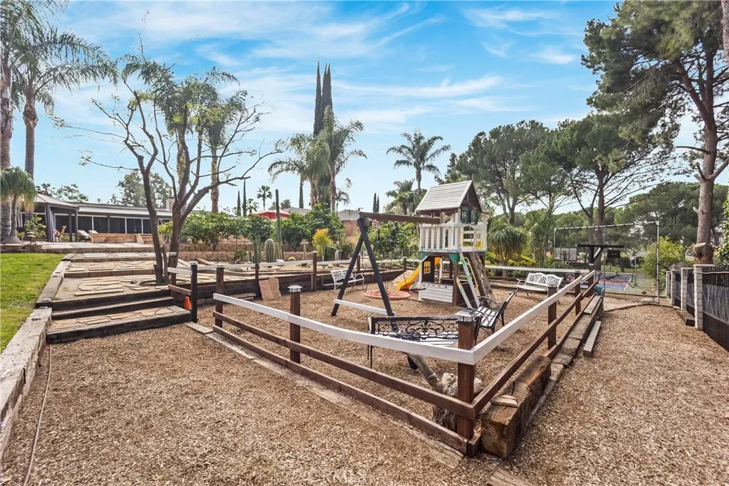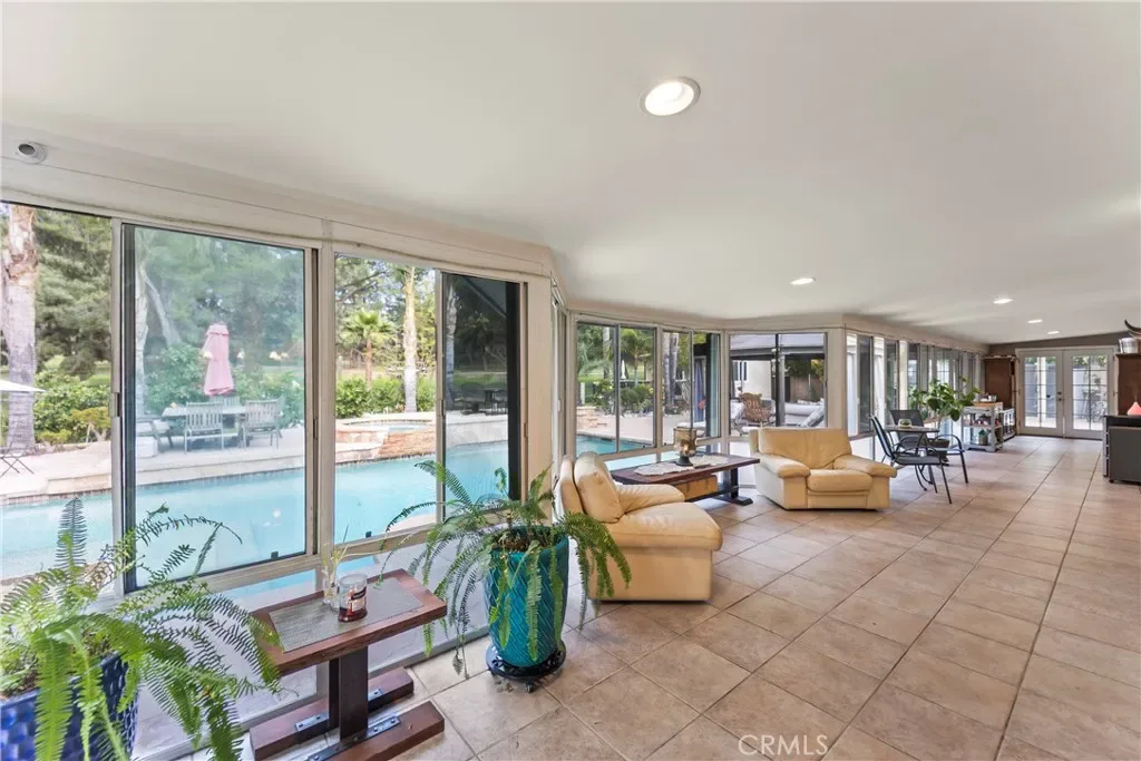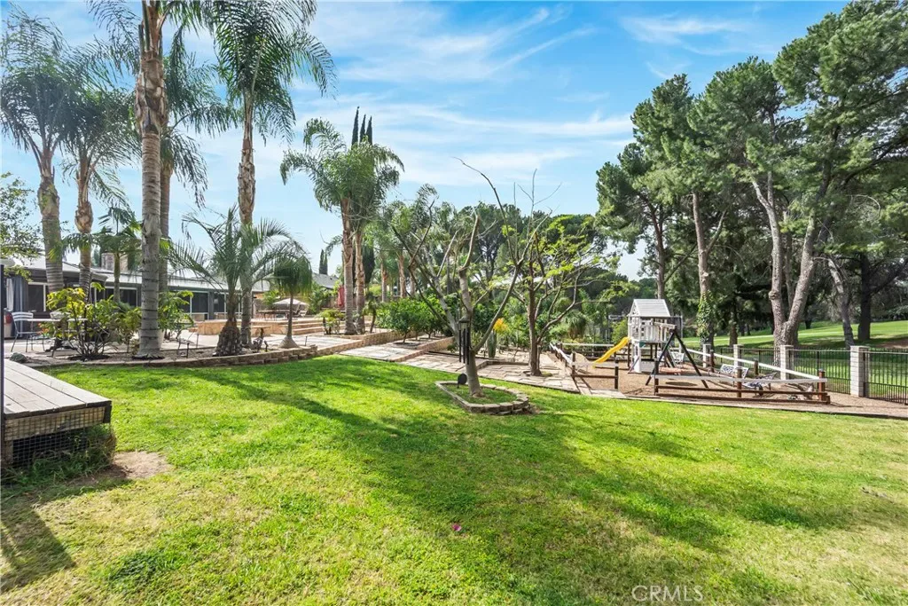 Welcome to a truly exceptional residence in the coveted Knollwood Country Club Estates—an inviting single level sanctuary set on a rare 20,564 sq.ft. flag lot with sweeping views of the 14th tee box. This home blends warmth, elegance, and resort style living in a way that instantly draws you in. A 160′ driveway leads you to the beautifully manicured grounds, complete with a charming water fountain, mature trees, and your very own 4 hole putting green. Step through the double front door and feel the openness of the vaulted ceiling living room, where a stunning fireplace and expansive windows frame the sparkling pool and lush backyard, creating a breathtaking first impression. The gourmet kitchen is both stylish and welcoming, featuring rich granite countertops, stainless steel appliances, and a two tier island perfect for cooking, gathering, and entertaining. The primary suite offers a peaceful retreat with vaulted ceilings, soft recessed lighting, serene pool views, a walk in closet, and a beautifully upgraded spa inspired bathroom. Another captivating feature is the sunroom—an impressive space wrapped in tinted windows, illuminated by recessed lighting, and highlighted by two 10 foot longview sliders and a striking 13 foot Marvin wood clad French door. Additional bonus areas include an approximately 550 sq.ft. sunroom and a 300 sq.ft. pool/guest house with its own bathroom, offering wonderful flexibility for guests, hobbies, or relaxation. These spaces are not included in the disclosed sq.ft. The backyard feels like a private resort designed for unforgettable moments. Enjoy a remodeled PebbleTec pool and spa, built in BBQ and fire pit, basketball court, playground, private driving range, terraced landscaping, and an abundance of fruit trees framed by Queen Palms and a charming cactus garden. This is more than a home—it’s a lifestyle. Solar panels are also paid off for your savings!