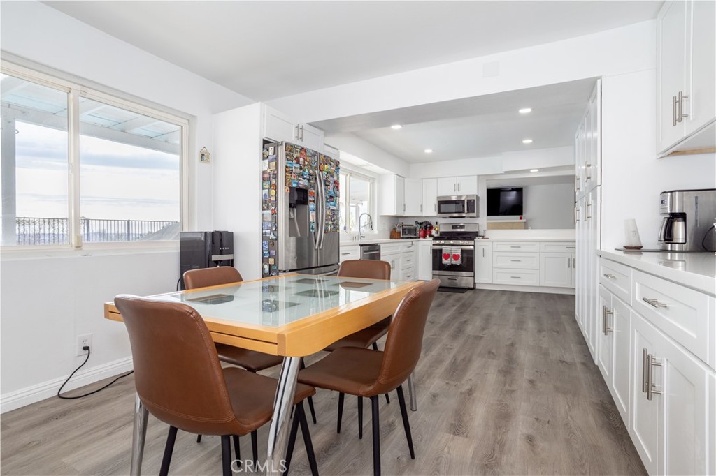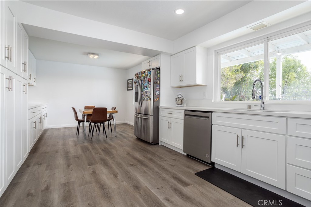 The newly remodeled kitchen is designed for both function and style with abundant cabinetry, quartz countertops, a dual-basin stainless steel sink, gas cooktop with ventilation hood, built-in appliances, and easy access to the large adjacent dining area.