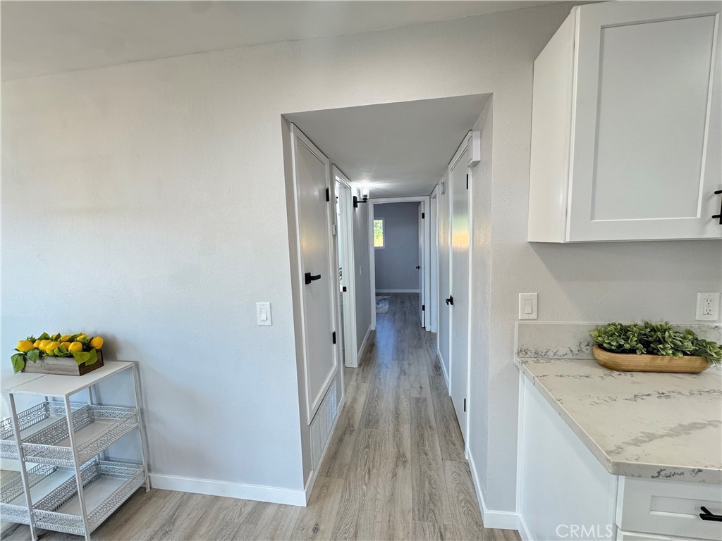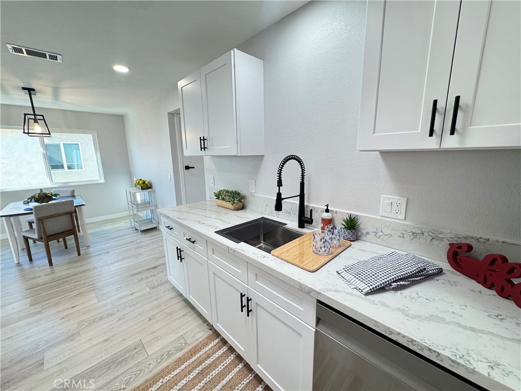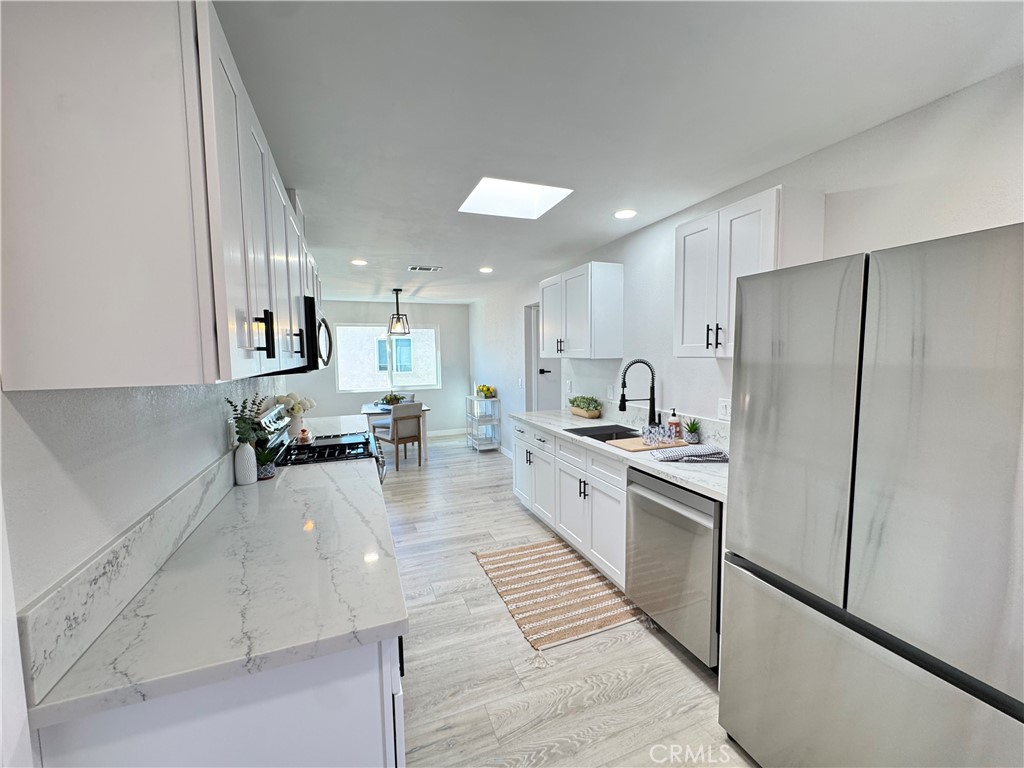 The remodeled kitchen has been thoughtfully redesigned and enhanced by removing the ceiling soffit to create a more open and airy feel. Features include soft-close cabinetry, quartz countertops, deep-set sink, Samsung appliance package (stove, refrigerator, dishwasher, microwave), recessed dimmable lighting, skylight, and a new dining area light fixture. Laminate flooring flows throughout the home, offering durability and easy maintenance.