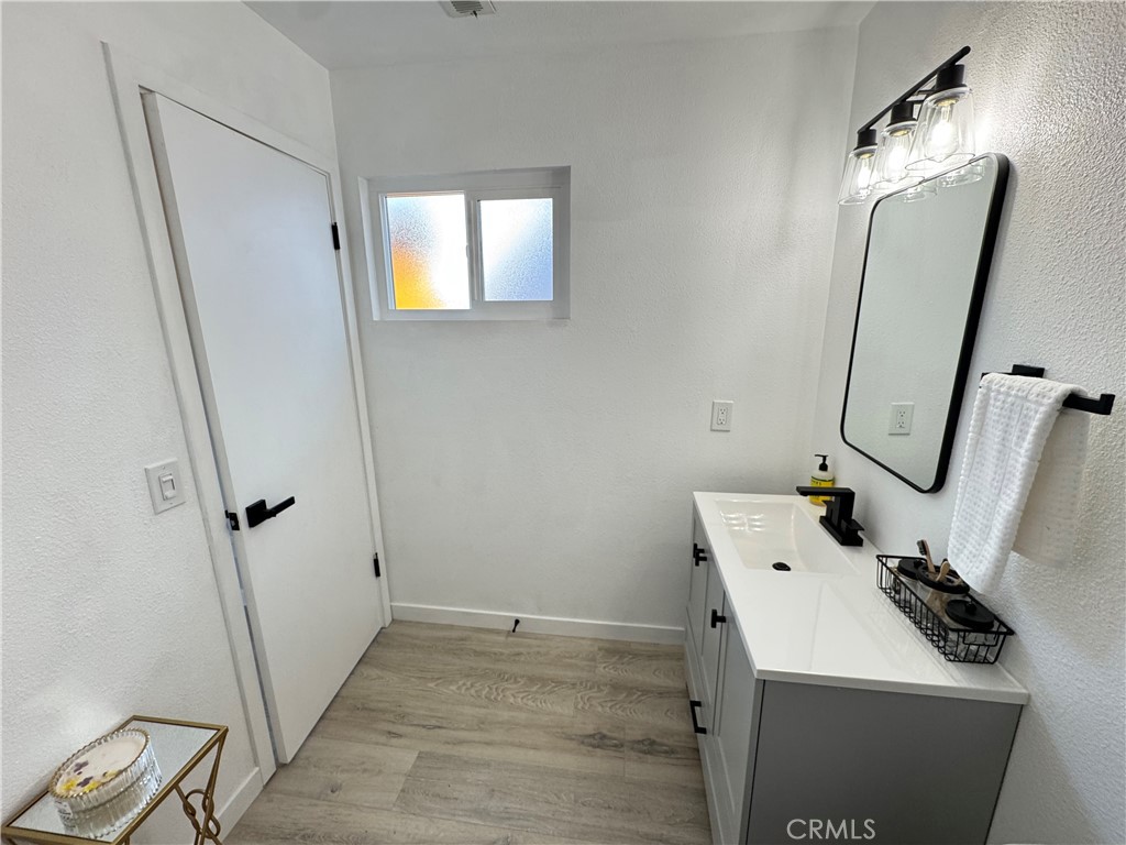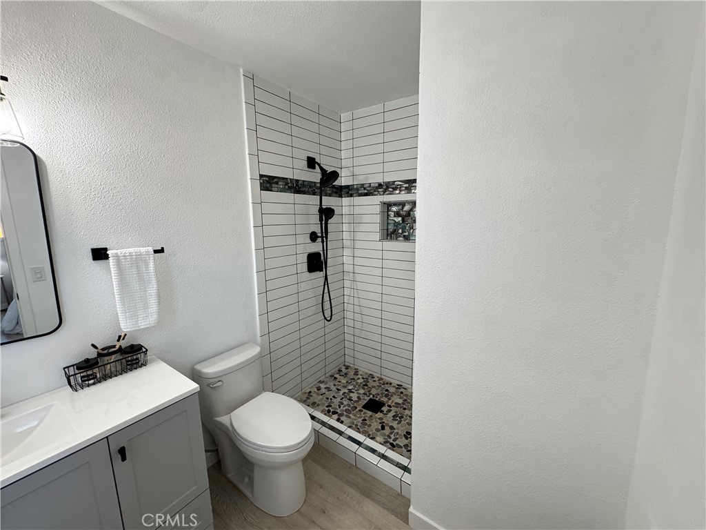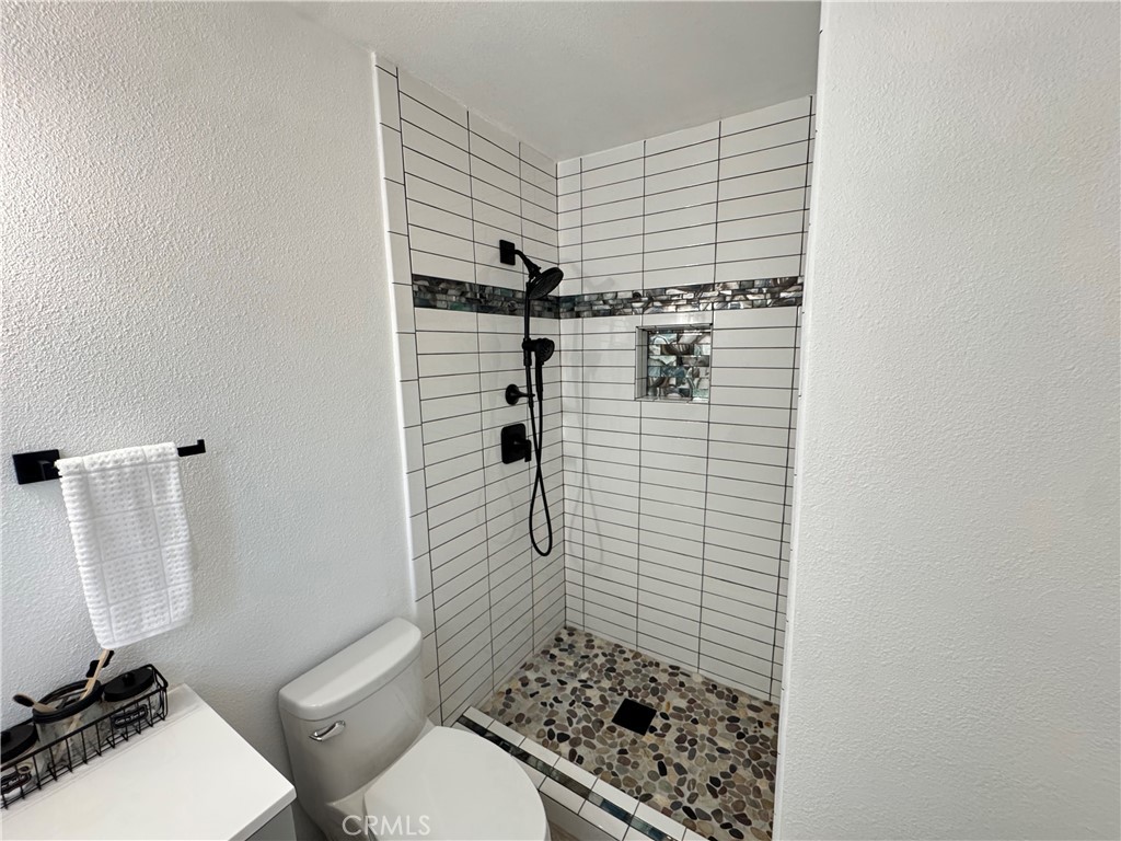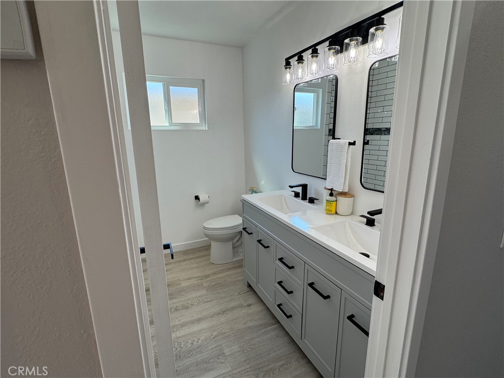 Both bathrooms have been fully upgraded with new vanities, fixtures, mirrors, lighting, and tile. The front bath offers a dual-sink vanity with a tub tiled to the ceiling, while the primary bath features a beautifully tiled floor-to-ceiling shower. Sleek black fixtures throughout complete the modern design.