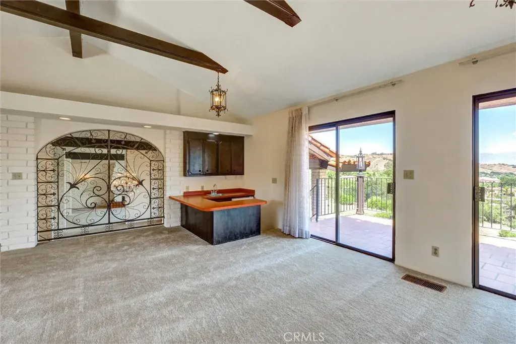 The light-filled living room features vaulted ceilings, and beautiful fireplace. The dining room boasts a Swarovski Crystal chandelier imported from Austria, and spectacular views of the San Gabriel Valley. The French doors in the dining room create seamless indoor-outdoor living.