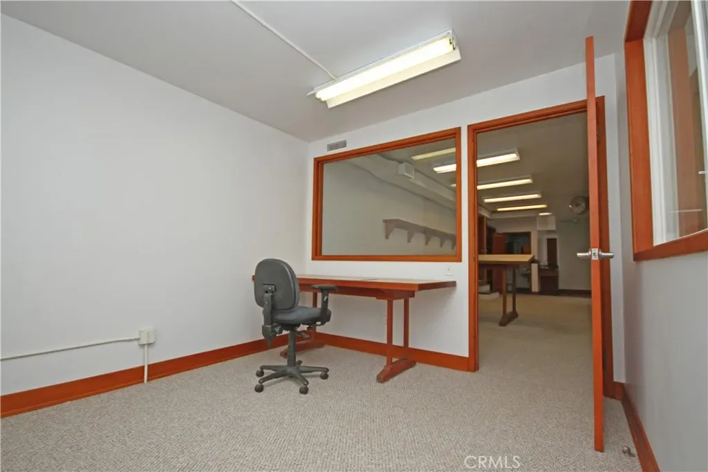 Upstairs, the unit includes an additional 510 square feet (approx.) of mezzanine office space, accessible via a catwalk from the warehouse or through the front entry staircase. The upper-level features one private office suite and a large, furnished communal office area, offering flexibility for administrative functions, meetings, or team workspaces. A second private restroom is located on this level for added convenience.