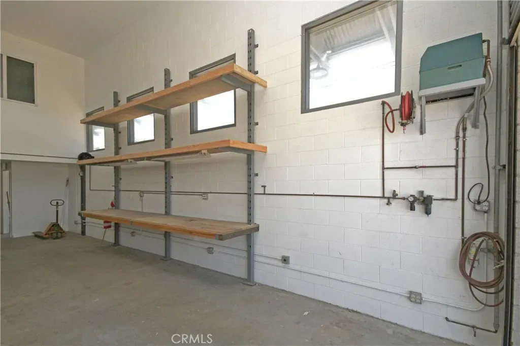 The unit is powered by 200 amp, 3-phase electrical service, with 220V outlets located throughout the downstairs industrial space. It is also outfitted with compressed air lines, making it suitable for businesses using pneumatic tools or specialized equipment. A forklift is available for use upon request, providing added convenience for loading and warehouse operations.