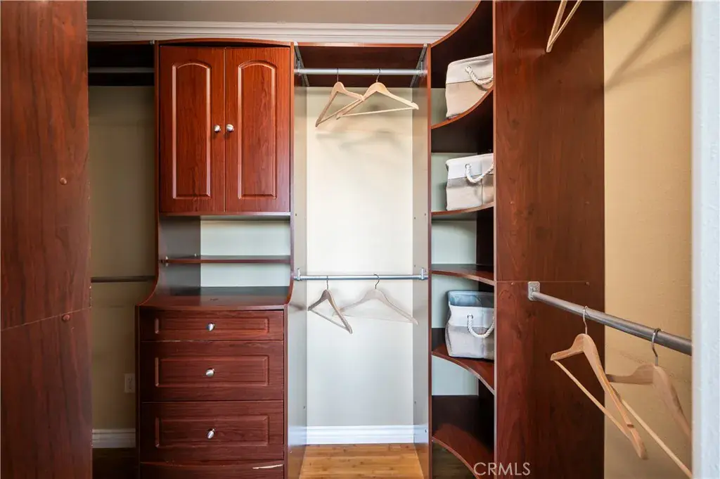 Upstairs, all three bedrooms are finished with carpeting. The remodeled primary suite boasts a hotel-like bath with a tiled shower, marble vanity with an LED mirror, and a custom walk-in closet with built-in drawers and shelves. Guest bathrooms include a full bath with a quartz vanity and LED mirror, while a powder room serves the main level.