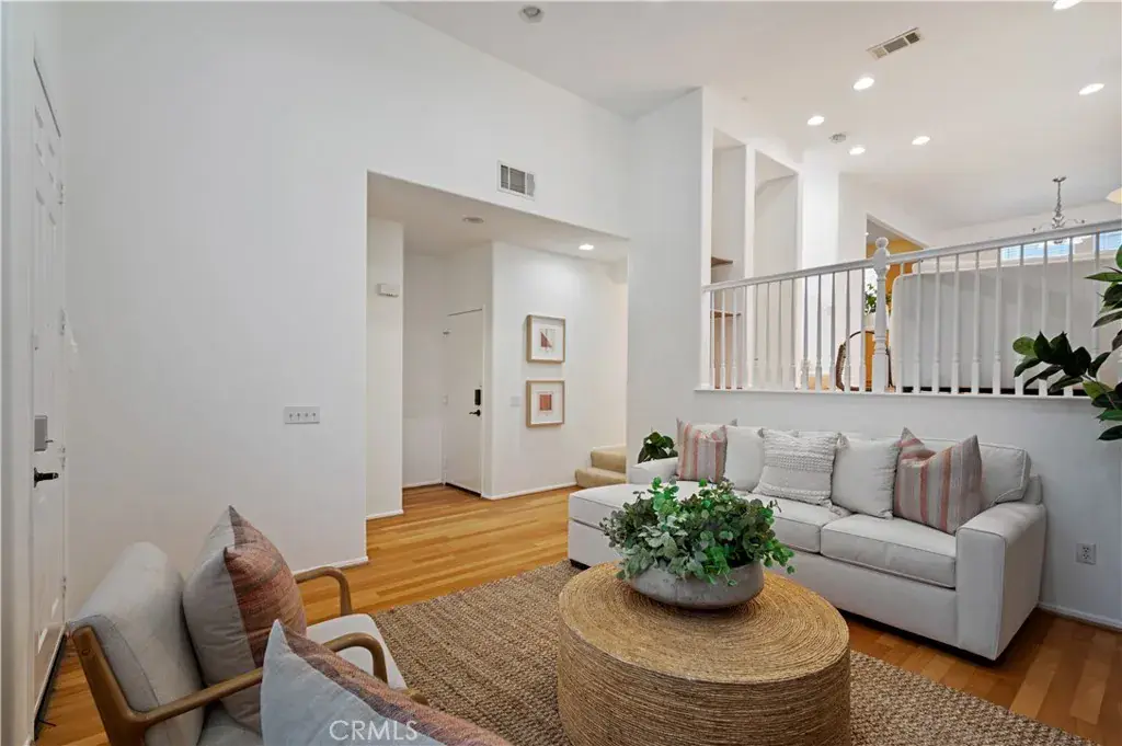 This detached Harbor City townhome is a true standout, with abundant natural light, modern upgrades, and a split-level design that feels both spacious and inviting. The light-filled 3-bedroom, 2.5-bath home offers soaring ceilings and tall windows that flood the living spaces with natural light. Hardwood floors flow through the main living areas, while the open kitchen with a center island and stainless steel appliances, including a built-in microwave, dishwasher, and stove, connects seamlessly to the dining room and a seating area, creating an ideal space for entertaining.