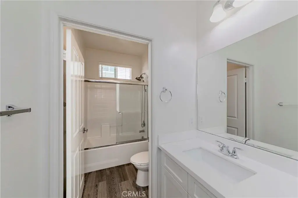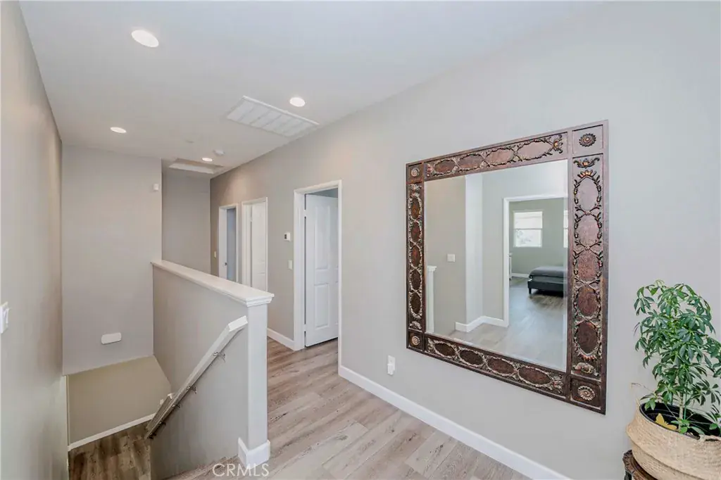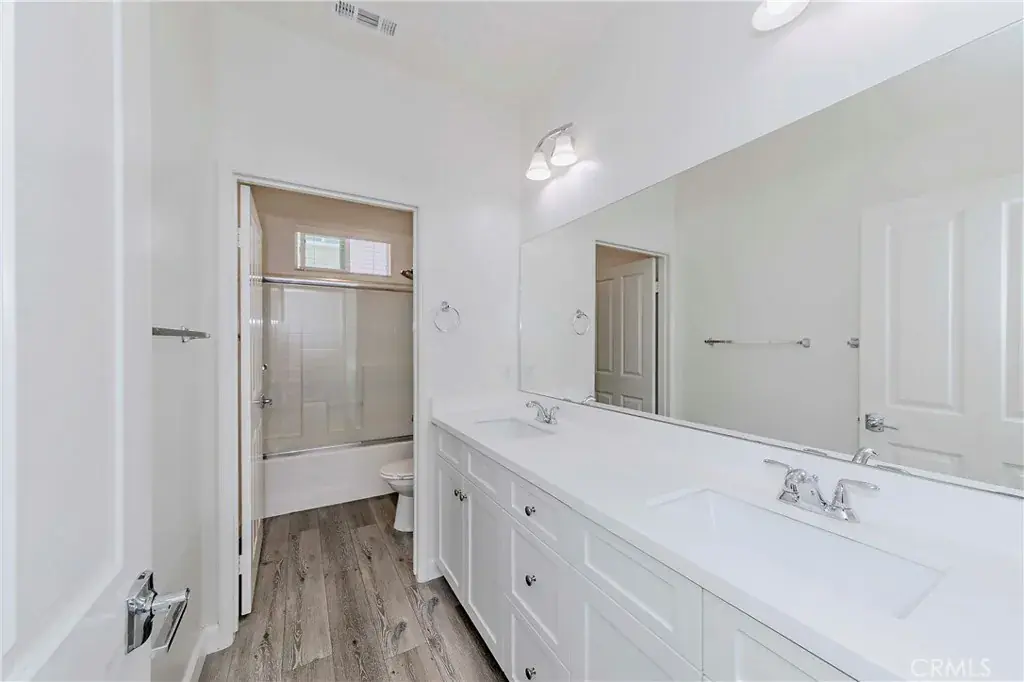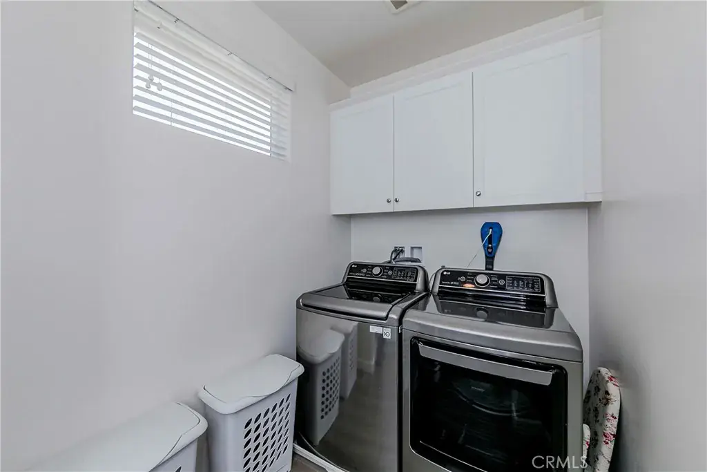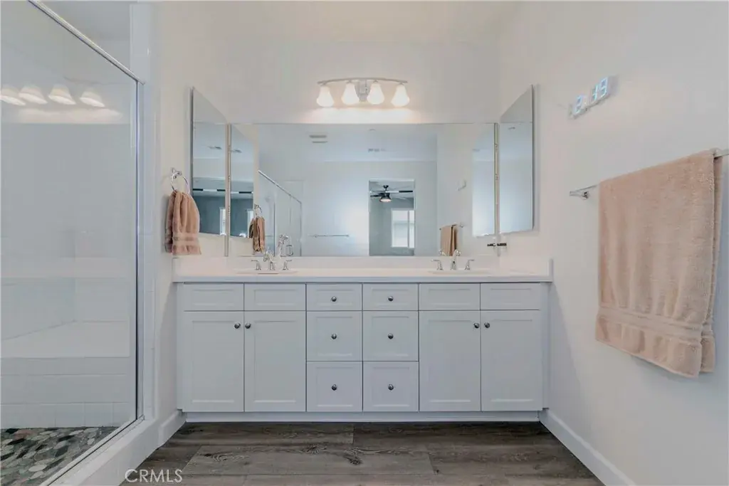 An elegant staircase with white risers leads to the upper level, adding a touch of brightness and contrast. The south-facing primary suite is filled with natural light and features a ceiling fan, built-in cabinet nook, walk-in closet, and a spacious bathroom with dual sinks and a glass-enclosed shower with a built-in tile seat. Two additional bedrooms include one with a walk-in closet and one with mirrored closet doors, both with ceiling lights. The hallway bathroom offers dual sinks and a glass-enclosed tub. An upstairs laundry room with built-in overhead cabinets adds everyday convenience.