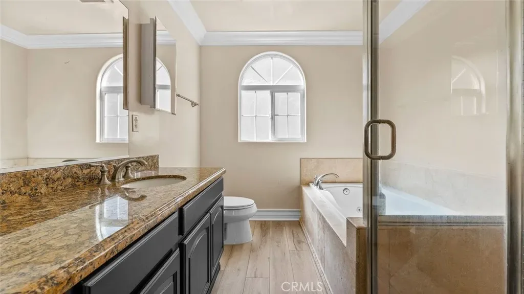 Upstairs you’ll find all four bedrooms, including a generously sized primary suite with vaulted ceilings, recessed lighting, and an en-suite bathroom featuring a separate shower and soaking tub. Additional highlights include central air and heat, fireplace, in-unit laundry, and an attached two-car garage with additional parking.Conveniently located near schools, shopping, dining, and major freeways.