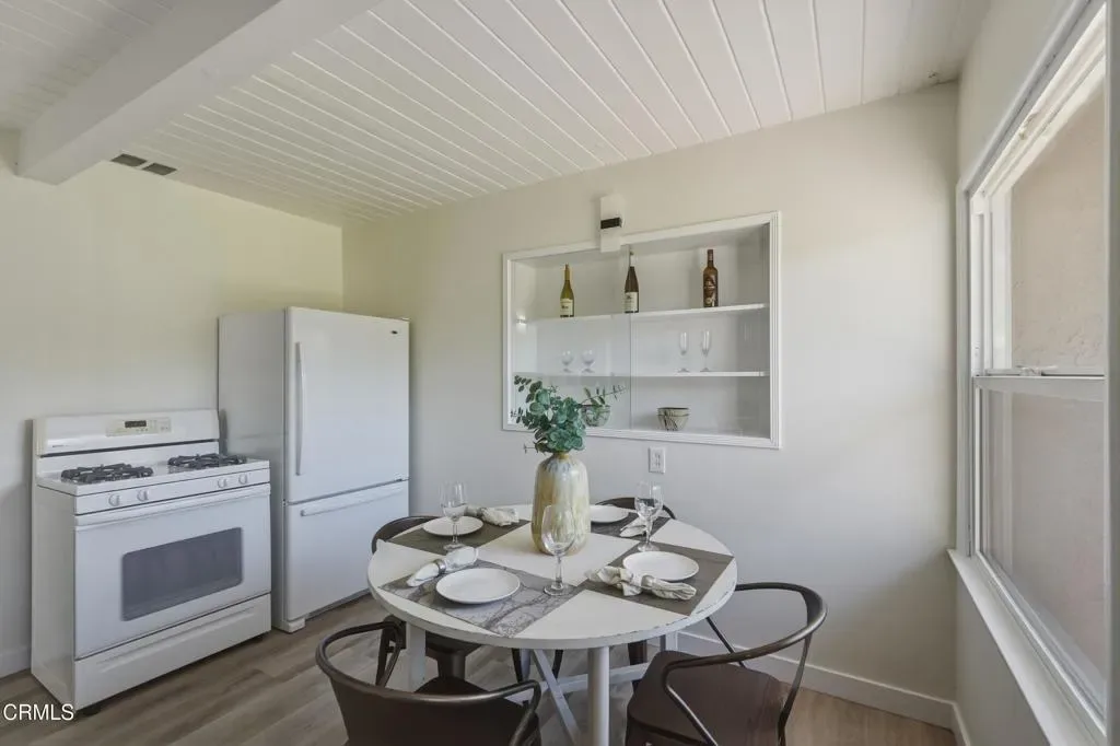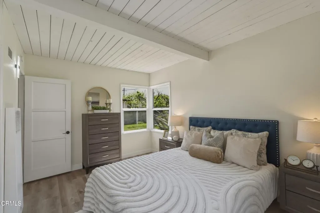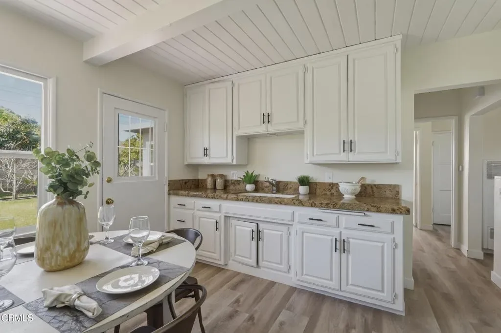 Charming and move-in ready, this 3 bedroom, 1 bathroom home in the heart of Hawthorne offers a perfect blend of comfort, style, and functionality. From the moment you arrive, you’re welcomed by a well-maintained front lawn, clean lines, and inviting curb appeal complete with a long driveway and covered parking. Inside, the home features a bright and airy living room with vaulted, beamed ceilings, abundant natural light, and updated flooring that flows seamlessly throughout. The thoughtfully designed kitchen offers ample cabinetry, granite countertops, and a cozy dining area with views of the backyard, creating an ideal space for both everyday living and entertaining. Each bedroom is well-sized with generous closet space, while the bathroom maintains its classic charm with well-kept tilework. Step outside to a spacious backyard featuring lush green grass, mature landscaping, a patio area perfect for outdoor dining, and a detached structure ideal for storage or potential creative use. Conveniently located near local schools, parks, shopping, and major freeways, this home presents an excellent opportunity for both homeowners and investors alike.