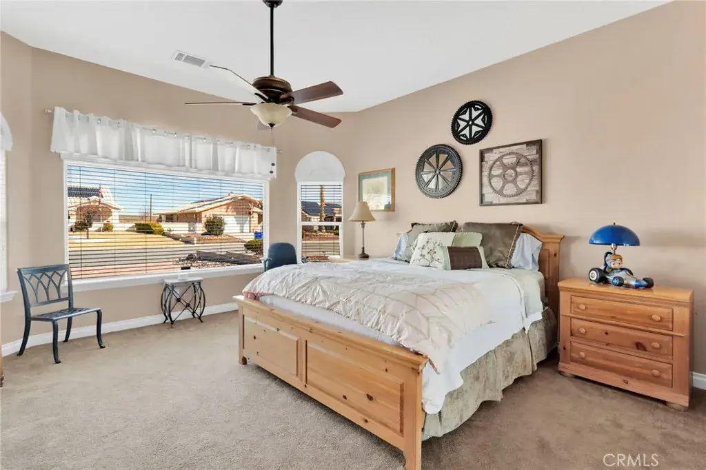 The open-concept living area is bright and spacious, enhanced by custom lighting and ceiling fans throughout, and opens seamlessly to the backyard with stunning views of Hole Five East. The primary bedroom is equally spacious, featuring carpet and a slider leading directly to the backyard. The primary bathroom is a true retreat with upgraded tile floors, granite countertops, dual sinks, a large walk-in shower with dual shower heads, and a separate lighted vanity.