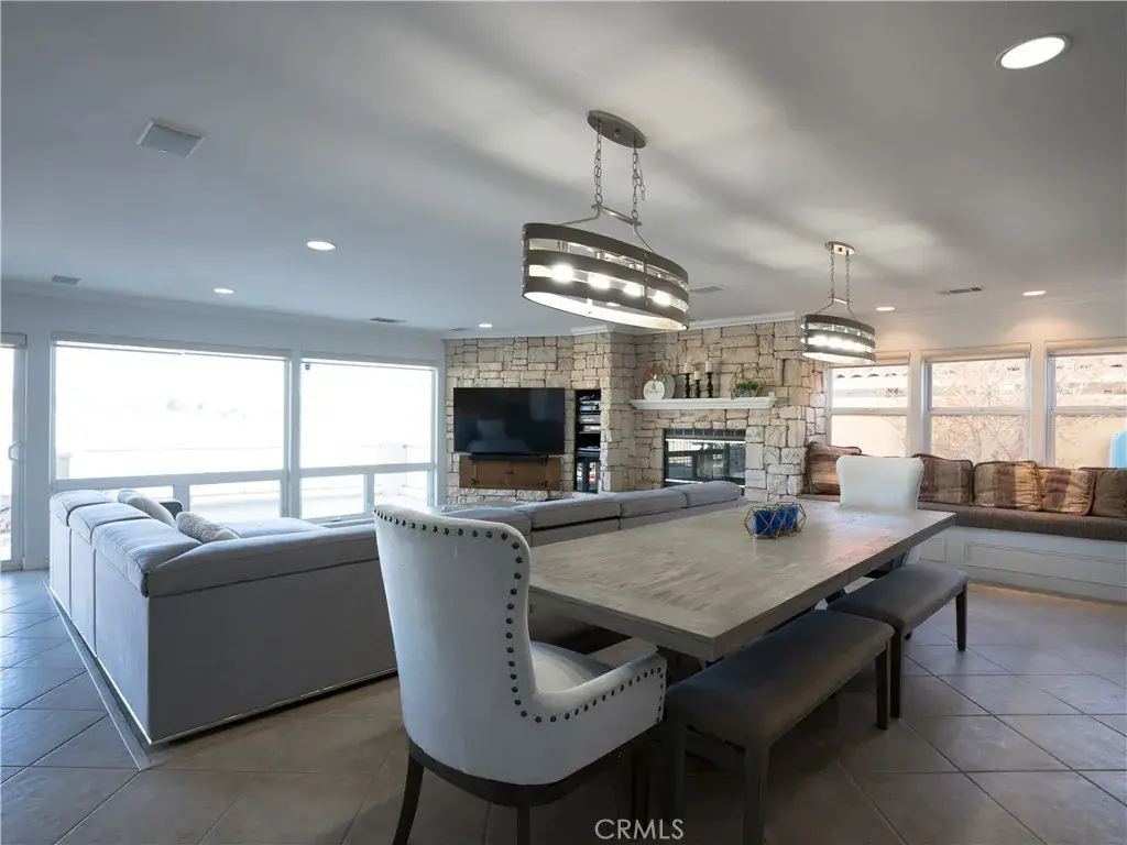 The home includes a stone fireplace, built-ins, a bar area, and modern light fixtures. Bedrooms feature shutters, and bathrooms include shower/tub combinations, with the primary suite offering a large shower and dressing table. Additional features include two-tone interior paint, newly painted baseboards, custom blinds with sunshades, an inside laundry room with washer and dryer, EV charging outlet, and a Trex dock.