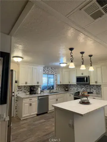 Renovated kitchen with new appliances, updated cupboards, modern countertops, new garbage disposal, faucet, sink, and updated plumbing (including under the home and bathrooms).