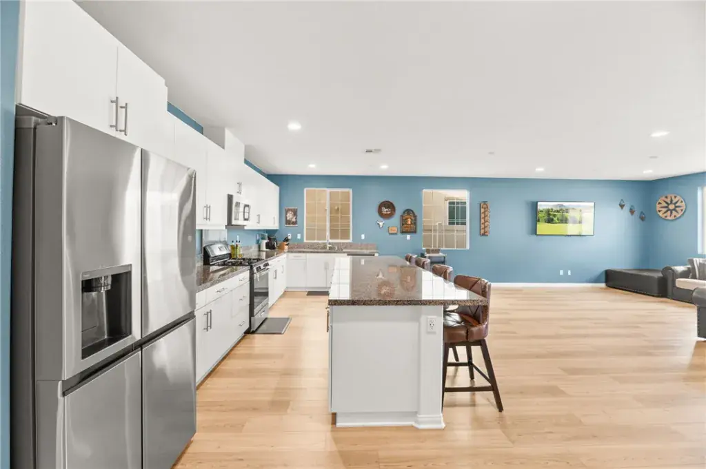 At the heart of the main living area is the oversized kitchen island, offering the perfect combination of functionality and style. Whether you’re cooking weeknight meals, hosting gatherings, or working from home, this island acts as a central hub for everyday life. The kitchen also includes generous cabinetry, ample counter space, and seamless visibility into the dining and living areas. Ideal for anyone who values both practicality and open living.