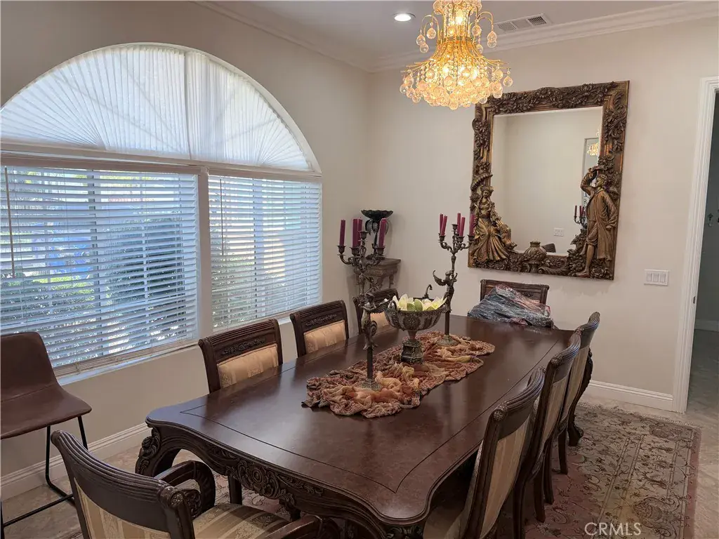 The gourmet kitchen showcases elegant custom cabinetry and premium stainless steel appliances, flowing seamlessly into the casual dining area. The oversized family room features built-in surround sound and opens through double doors to a spacious covered patio—ideal for indoor-outdoor living.