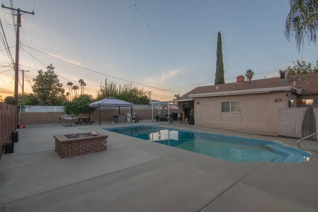 Welcome to this charming 3-bedroom single-story home offering 1,637 square feet of comfortable living space on a generous 9,583 square foot lot. Built in 1964, this inviting Hemet residence blends classic character with modern potential. The spacious interior features a bright and inviting living room with a cozy fireplace, a functional kitchen with ample cabinetry, and a dedicated dinning area for family meals or entertaining. Step outside to a large private backyard, perfect for entertaining, relaxing, complete with a ground pool.