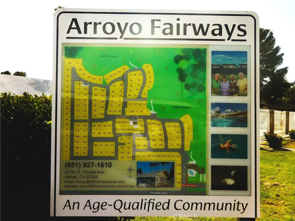 3 Bedroom 2 Bath doublewide 55+ Senior Community at Arroyo Fairways-resort-like living! Arroyo Fairways has many amenities to offer including free use of the 9-hole par 3 golf course, clubhouse, full kitchen facilities, swimming pool/spa, BBQ area, horseshoes, dog run, bingo, shuffleboard, gaming tables, billiards, different activities hosted by the park. Wonderful grounds maintenance keeps the park immaculate! This Park is surrounded by the breath-taking views of the San Jacinto and Idyllwild Mountains. Home is tucked back in a quiet location. Two full length awnings provide shade while allowing an abundance of natural light in! Upon entry you will be greeted with a warm and inviting atmosphere. Living room focal wall ready-wired for your entertainment needs. Other improvements include upgraded kitchen cabinets with pullout drawers, new Formica countertops, laminate flooring throughout (no carpet), remodeled hall bathroom with walk-in shower, roof coating installed 2024, newer energy efficient windows in living room/dining room. Appliances include oven/range, microwave, refrigerator, freezer, washer and dryer. Spacious primary bedroom with large closet. Primary bathroom has ample cabinet space, separate shower and bathtub. Two nice size secondary bedrooms. Dedicated laundry room includes washer, dryer and above shelving with direct access to the carport, two big sheds in the back of the home for extra storage. Minutes to medical facilities, shopping, eateries, movie theater, the famous Ramona Pageant, Soboba Casino Resort for some entertainment outings! If you are looking for comfortable affordable living look no further! Call for your private showing!