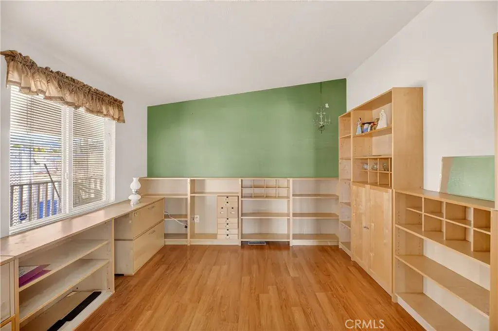 Three bedrooms, including: A converted office with abundant storage cabinets, a built-in desk, and wrap-around workspace.