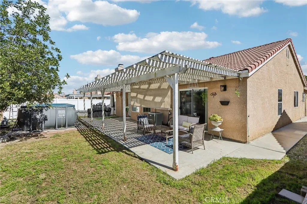 Welcome to this spacious and well-designed home featuring vaulted ceilings, an open floorplan, and the added benefit of a solar lease for low utility bills—all with no HOA, low taxes and low utilities. A charming front paver patio creates a warm and inviting entry. Inside, formal living and dining areas greet you just off the foyer, offering the perfect setting for gatherings. The layout flows seamlessly into the open family room, kitchen, and breakfast nook, creating an ideal space for everyday living. The family room is highlighted by a tile-framed fireplace, adding comfort and character. The kitchen offers ample cabinetry, a center island with bar seating, and excellent functionality for entertaining or meal prep. Down the hallway, you’ll find three bedrooms, two bathrooms, and a spacious laundry room with direct access to the attached 2-car garage. Retreat to the oversized primary suite, featuring a sliding glass door with patio access and an en-suite bathroom complete with a soaking tub, dual-sink vanity, and separate shower. Go outside through the french door in the family room to a generously sized covered patio surrounded by mature trees, offering shade and privacy. An above-ground pool is included and can be removed at the buyer’s request. Ideally located near Mary Henley Park, shopping centers, dining options, and local schools, this home combines comfort, efficiency, and convenience in a desirable setting.