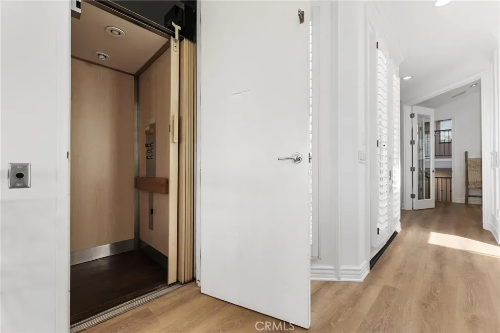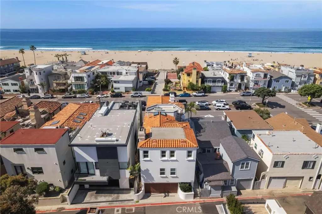 The dining room features coffered ceilings and a built-in buffet, while the kitchen is equipped with JennAir appliances, dual ovens, wine refrigerator, and a large skylight for natural light. A second terrace off the kitchen leads via spiral staircase to a rooftop deck with firepit, where panoramic views extend across the coastline offering additional outdoor living space. The main level also includes a powder room, den/office, a closet pre-plumbed for optional laundry and a 3-stop elevator servicing all levels of the home. On the entry level, the primary suite is positioned to capture unobstructed ocean views and features a fireplace, private terrace, and spa-like bath with dual vanities, soaking tub, glass shower, and oversized walk-in closet. Two additional bedrooms and a full bath complete this level. The property offers exceptional storage and 6-car parking, including a two-car front garage, two-car driveway, and a two-car rear garage off the alley. A dedicated laundry room and a versatile studio with bath—ideal for office, gym, or guest space add flexibility. At the rear of this Single Family Residence, a separate/connected three-level 2-bedroom unit provides private living with its own entrance and garage. The top level features vaulted ceilings, open living/dining, ocean views, kitchenette, fireplace, terrace, and powder room, while the lower level includes two bedrooms, a full bath, and in-unit laundry. 2304 Hermosa Avenue stands as a rare coastal offering, combining panoramic white-water views down a picturesque Walk Street, immediate proximity to the beach, and a uniquely flexible layout with multiple living spaces and separate units that create a wide range of lifestyle and investment possibilities.