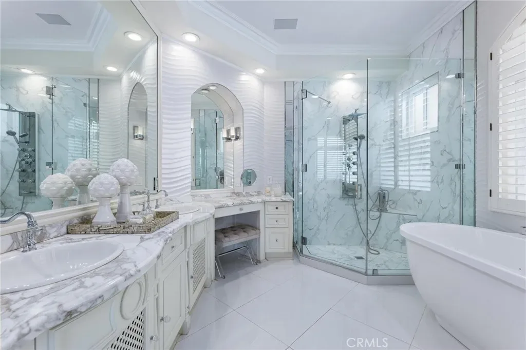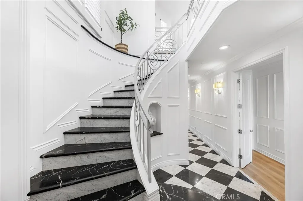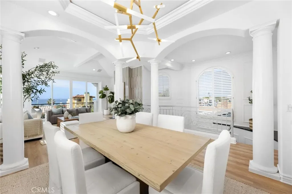 Perched above one of Hermosa Beach’s most picturesque Walk Streets, 2304 Hermosa Avenue captures sweeping white-water ocean views from Palos Verdes to Malibu. With unobstructed sightlines down the Walk Street to the sand and ocean views from every level, the home offers a rare coastal vantage point. Enter into a grand foyer with soaring vaulted ceilings, wainscoting, and marble flooring. The upper level reveals expansive living spaces framed by breathtaking ocean views, where the living and dining areas flow seamlessly beneath vaulted ceilings with recessed lighting. The living room opens to a large private terrace overlooking the Walk Street and ocean, creating an ideal setting for outdoor dining and lounging.