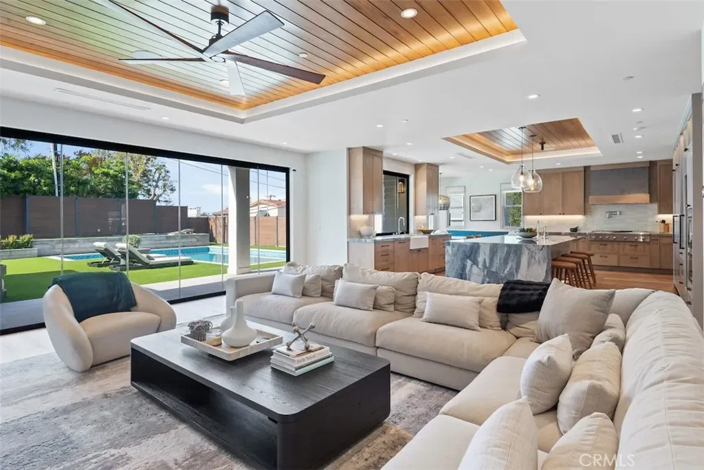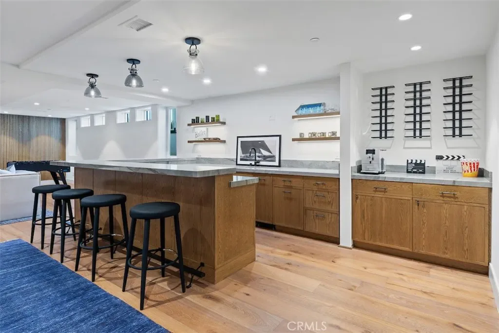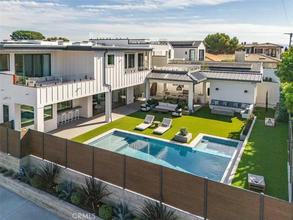 Welcome to this extraordinary custom estate perched in the Hermosa Hills and set on a large, flat corner lot – an exceptional rarity in Hermosa Beach, where modern design and coastal luxury meet. With 7 bedrooms, 7.5 baths, and over 7,800 square feet of impeccable living space, this home offers the best of coastal living: elevated design, breathtaking views and effortless sophistication. The architectural craftsmanship is unmistakable—an oversized pivot wood front door, wraparound front deck and an open-concept layout that seamlessly blends indoor and outdoor living. A dramatic glass-encased elevator serves as a sculptural centerpiece, connecting each level with ease. The main living area features a stone fireplace, wood-detailed ceilings and folding glass walls that open to an entertainer’s dream: a covered outdoor pavilion with kitchen pass-through, bar seating, pool and spa, fire pit and built-in lounge seating—all enhanced by custom lighting for an inviting nighttime ambiance. The gourmet kitchen is both functional and beautiful, showcasing a waterfall island of natural stone, designer backsplash, custom cabinetry and a cozy built-in breakfast nook. A formal dining area and multiple living spaces offer room for gatherings large and small. Upstairs, the primary suite is a serene retreat with a private terrace, marble-clad bath, soaking tub, and adjacent office with its own ocean-view patio. The lower level is pure leisure—complete with a full bar, movie theater, game room, and home gym. Every detail has been curated for luxury living: custom railings, designer fixtures, home automation, sound and theater systems throughout, security cameras, a full water filtration system and a four-car garage with built-in storage.