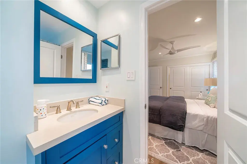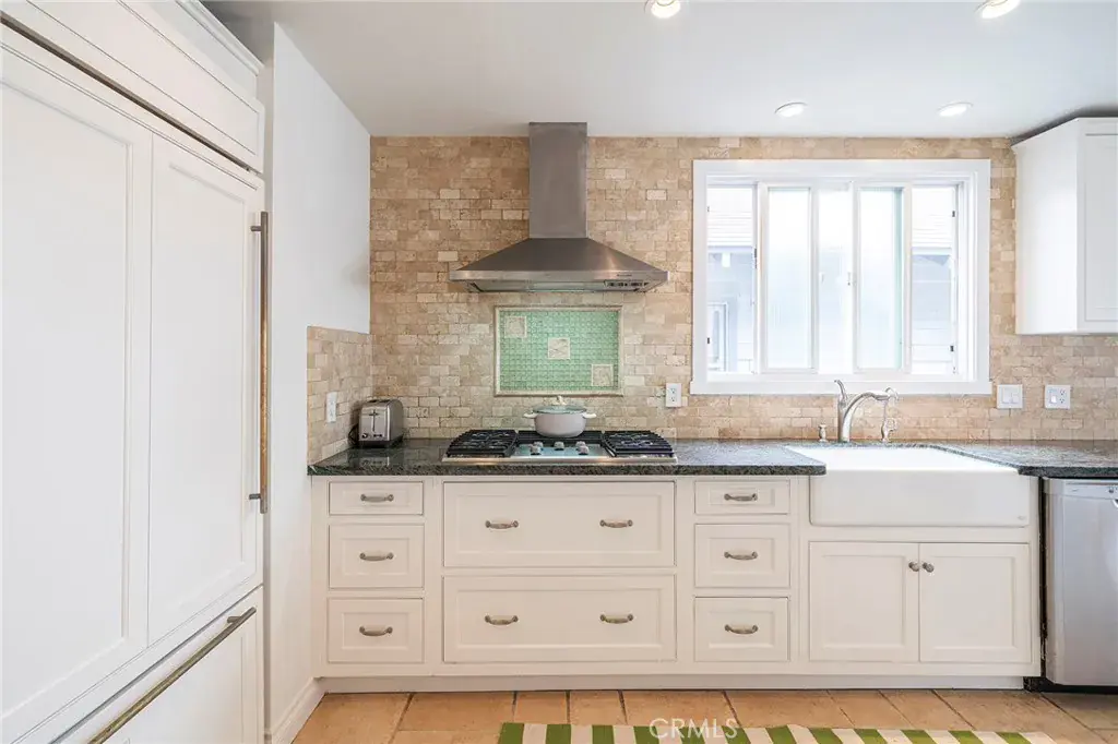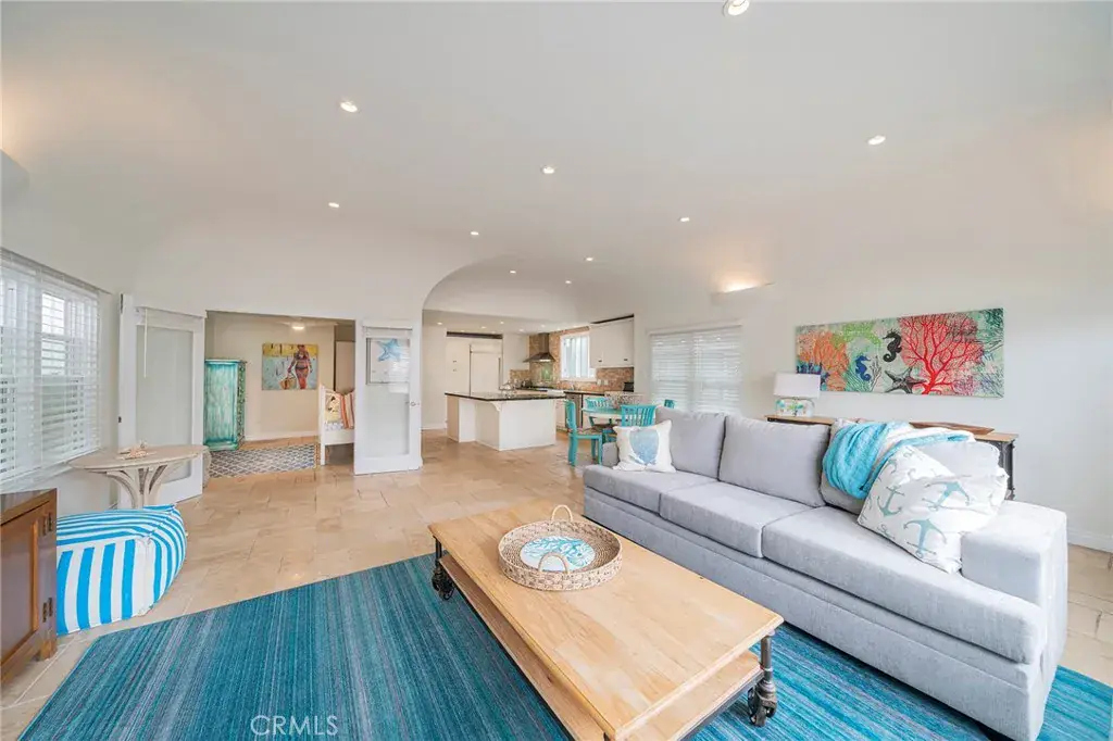 The original “Beach House”. This home was moved from its original Strand location. It was a community gathering spot. Now the home sits on 17th street, just steps from The Strand on one of Hermosa’s prime walk street locations. The front yard is spacious and well appointed with plants, BBQ, outdoor sectional, dining table, and chaise lounge chairs! Upon entering the home, you will find the main living room open and inviting. Travertine flooring runs through much of the home, with new flooring in two bedrooms. The kitchen is adjacent to the living room with an open floor plan layout, granite countertops, a KitchenAid built-in refrigerator, and KitchenAid appliances. The kitchen was remodeled 10 years ago and has just been freshened with newly painted cabinetry. The entire home is freshly painted with new window coverings. The furnishings have been recently purchased for this amazing rental. The high ceilings make for a fantastic entertaining space. One bedroom opens up to the living room with french doors, the bed is a Trundle Daybed in this bedroom. This bedroom is very private when the french doors are closed. This bedroom can also make for a fantastic office space. Two additional bedrooms are just down the hallway one has a queen bed and the other a king bed. Two bedrooms have ensuite bathrooms, and the other has access from the hallway to one of the bathrooms. All bedrooms have mounted TVs for your viewing pleasure, as well as ceiling fans too! Laundry is to the rear of the home for your private use.