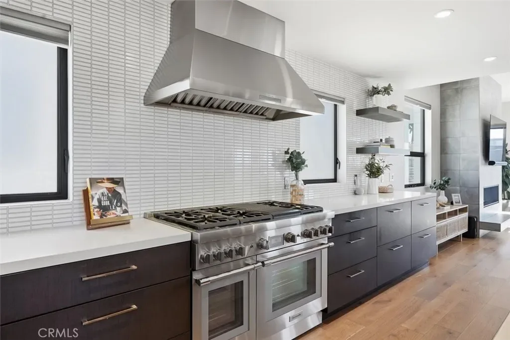 Step up to an exceptional open concept floor plan that offers extraordinary entertainment possibilities, and effortless everyday living. The extensive great room is both phenomenal and sophisticated—wide plank wood floors tastefully adjoin a focal point fireplace that creates a warm and peaceful ambiance. The sparkling wall of glass doors allows sunlight to filter throughout the home and opens to vast west-facing ocean views, offering a refreshing backdrop of fresh air and spectacular sunsets. Seamless indoor-outdoor living defines this level, extending the experience to a rooftop deck with breathtaking panoramic views—the surroundings are plentiful and endlessly inviting.