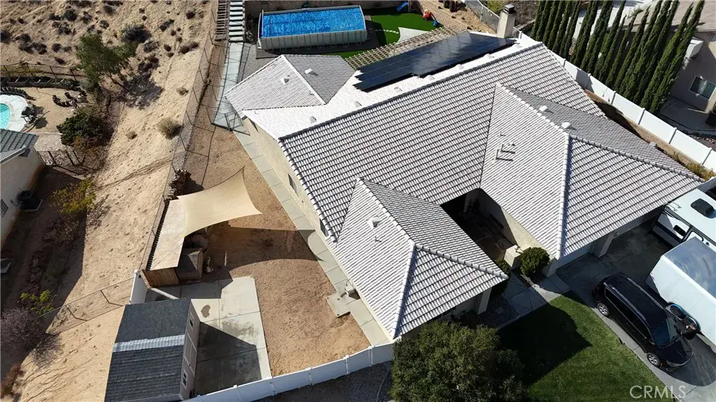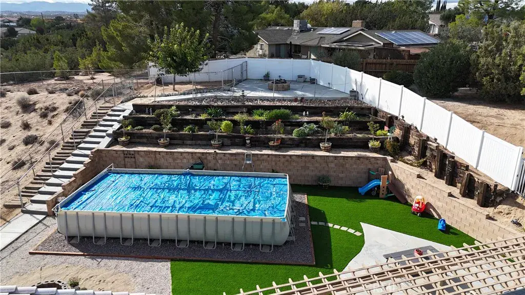 This home sits on just shy of a half-acre lot. The front and back yards are beautifully landscaped with fruit trees, vegetables, roses, aromatic flowers, rock landscapes as well as real grass in the front and artificial grass in the back. In the front yard there is a large driveway with plenty of parking as well as a second driveway that gives access to the back yard. There is a 30amp outlet to plug an RV (or whatever you would like) in. The backyard has a large built-in dog run with two levels, the lower has a large dog patio and the upper has a shade tree. The back yard has a 16×32 foot above ground pool which was installed 2 years ago. The backyard has lighting that can be controlled by an app. Recently added on the upper level of the backyard is stamped concrete, electrical outlets, water spigots and a gas firepit which overlooks the desert/mountain views. Additionally in the backyard is a 20×10 storage shed.