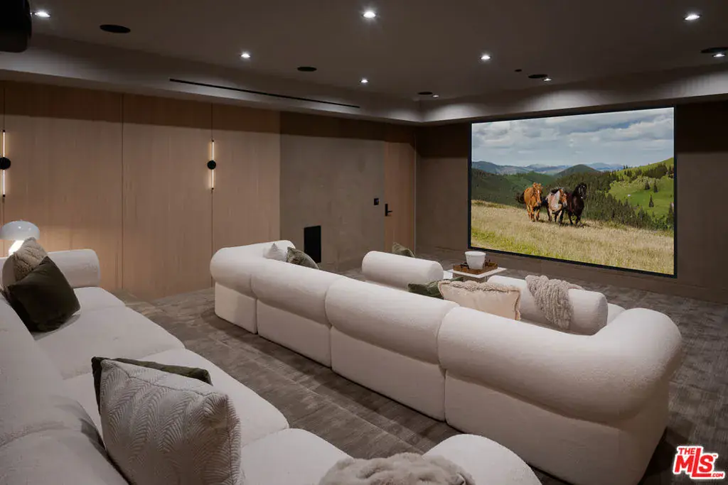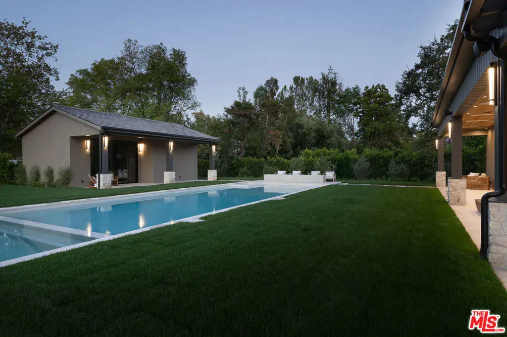 Behind the gates of Hidden Hills, where privacy meets prestige, lies a modern farmhouse of exceptional warmth and character. Designed for those who love to entertain and live beautifully, this residence spans approximately 12,780 sq.ft. of living space and (over 15,000 sq.ft. total including garage and covered patios), blending natural textures with thoughtful architectural details. A circular driveway leads to a grand entry foyer that opens to sun-filled living spaces, an inviting family room with glass wine displays, an elegant dining area with cocktail bar, and a luxurious family kitchen featuring dual counter islands additional full chef’s prep kitchen, and walk-in pantry. The main level also includes an office with a glass-enclosed car gallery and a private guest suite. The lower floor/basement level is devoted to wellness and leisure, offering a gym with steam shower and sauna, glass sliding doors opening to a tranquil outdoor patio, a theater room, bar with counter seating, and lounge area with big screen TV, guest/maid suite, and a secure safe room. Upstairs, the primary suite features a private balcony, dual walk in closets, and a spa-like bath, accompanied by four additional en-suite bedrooms and a laundry room. Outdoors, a resort-style setting awaits – with a vast pool and spa, outdoor dining and BBQ pavilion, lush lawns, mature trees, and a separate one-bedroom, one bathroom ADU. A six – car garage, with an additional six parking spaces complete this extraordinary estate, crafted for elegant living in one of Los Angeles’ most coveted gated communities.