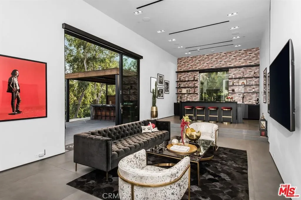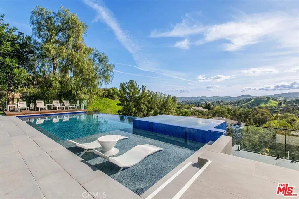 The Glass House — a design masterpiece with sweeping, unobstructed views across rolling hills to distant mountains. Set on just over an acre in premier, gated Hidden Hills, this 7,000± sq ft modern estate offers 5 bedrooms plus a private office and 6 baths, crafted for effortless Southern California indoor-outdoor living and ultimate privacy. Flooded with natural light behind an 18-foot glass wall and dramatic pivot entry, interiors showcase soaring ceilings, polished Italian floors, a sculptural floating staircase and top-tier finishes: three kitchens (the main with oversized eat-in island), imported marble, Italian cabinetry, Miele appliances, Waterford faucets, Porcelanosa baths and full Fleetwood windows/doors that disappear to the resort-caliber backyard. The upper-level primary suite is a serene retreat with a private balcony, spa-like bath and boutique his-and-hers walk-in closets. Outside, entertain in a dramatic setting with an infinity-edge pool and Baja shelf, floating spa, sunken open-air fireplace, fully equipped outdoor kitchen, bar and Fisher & Paykel BBQ area — all framed by mature palms and panoramic vistas. Additional highlights: guarded community entry plus private gated driveway, ample parking, three-car garage, anodized glass paneling, 8-zone Mitsubishi HVAC, dual tankless water heaters and meticulous landscaping. Minutes from The Commons at Calabasas and Woodland Hills, this residence blends turnkey luxury with unrivaled privacy and view-driven drama.