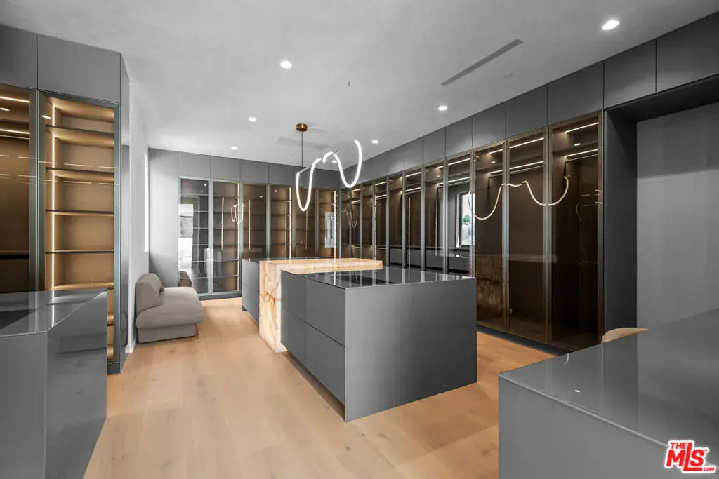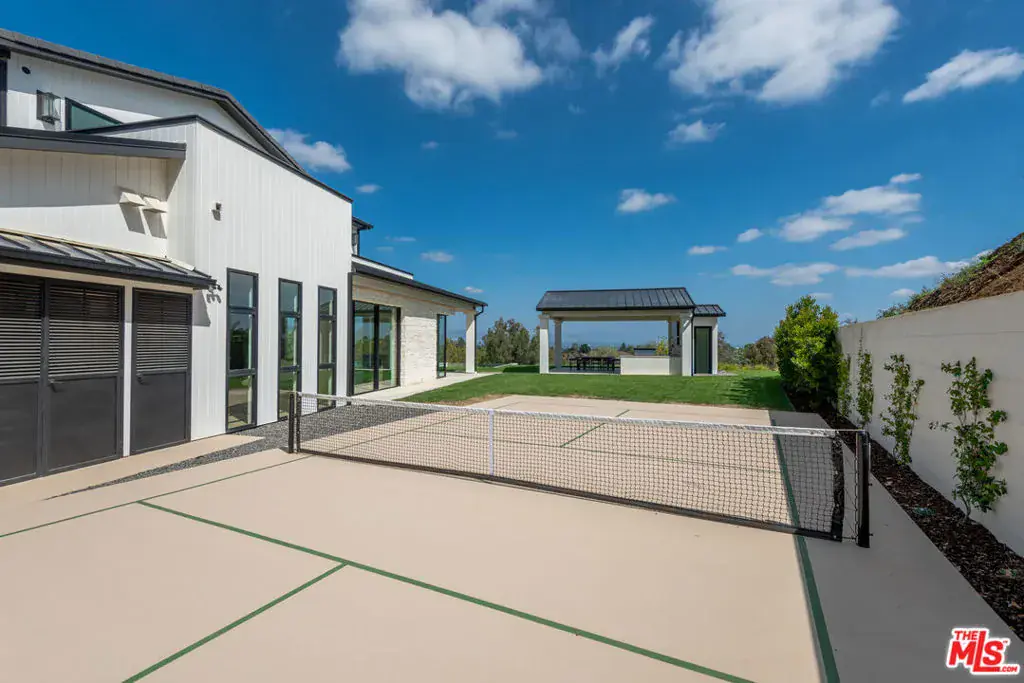 Panoramic views and curated design define this gorgeous, newly constructed estate, nestled at the end of a quiet cul de sac and sited on a large private lot within the guard-gated community of Hidden Hills. Perfectly positioned to capture the sweeping pastoral and city light views, this custom-built residence delivers a seamless blend of elevated architecture and indoor-outdoor living. The sunny, open floor plan centers around a stunning chef’s kitchen with oversized island, prep kitchen, and counter seating that flows into the dramatic great room, anchored by a two-sided fireplace & sliding walls of glass that frame the endless views. Designed for grand scale entertaining and everyday comfort, the home features a spacious game and recreation room, custom home office, dedicated wellness wing with gym, steam room & sauna, a plush home theater with fabric covered walls, a sleek lounge with wet bar, and a glass encased, refrigerated wine cellar. Both levels include an additional den or flex spaces, and all six ensuite bedrooms are thoughtfully designed, connected by a floating architectural staircase and serviced by an elevator. The luxurious primary suite is a true retreat, complete with fireplace, stone-wrapped spa bath with steam shower, boutique sized custom closet, and a large, wraparound balcony with commanding views. The estate comprises four distinct structures. In addition to the main residence, which includes garages for seven cars with custom epoxy floors, the grounds feature a pool pavilion complete with a built-in barbecue and pool bath, a detached 965 square foot guest house tucked away on the lower pad for added privacy, and a two-stall barn/stable for equestrian or flexible use. Outdoor amenities are curated for year-round enjoyment and include a sparkling, zero edge infinity pool & spa, multiple covered patios, a fire pit lounge, exterior fireplace and a private pickleball court! Perfectly located within Hidden Hills, just a few blocks from the entry gate and close to top-rated public and private schools as well as The Commons at Calabasas, this one-of-a-kind estate offers space, sophistication, and 24 hour, guard gated security in one of Southern California’s most sought-after communities.