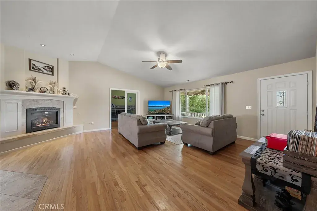 Tucked at the end of a quiet court, this spacious single-level home offers 5 bedrooms plus a flexible den—ideal for home office, playroom, or guest space. Four bedrooms are positioned in a dedicated wing alongside two bathrooms and a laundry room, making it easy to keep daily routines organized. The primary suite is privately located on the opposite side and features direct access to the backyard, an en-suite bath with double vanity and walk-in shower, and an attached den with glass French doors opening to the living room. The backyard is flat and level, thoughtfully maintained with shaded areas that create a safe, kid-friendly space perfect for playtime or relaxed outdoor gatherings. The main living area boasts vaulted ceilings, hardwood floors, and a fireplace, flowing seamlessly into the spacious kitchen with tile flooring, a large center island with propane cooktop, double oven, and generous sized pantry.