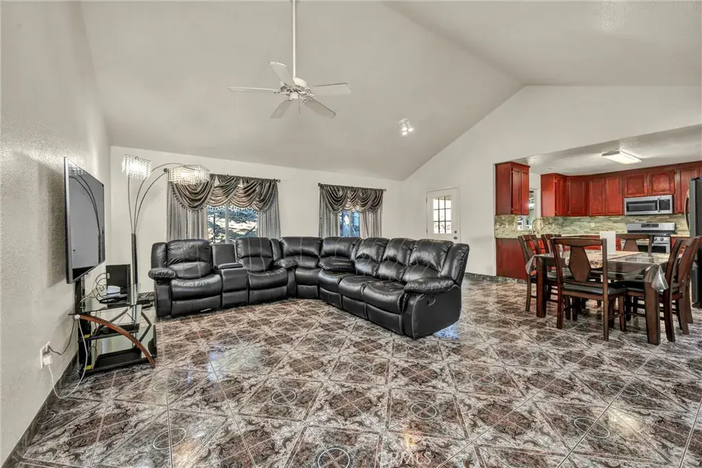 Step inside to find durable tile flooring throughout the main living spaces, perfect for easy maintenance and a cohesive flow. The spacious living room features soaring vaulted ceilings, recessed lighting, and a ceiling fan for comfort year-round.