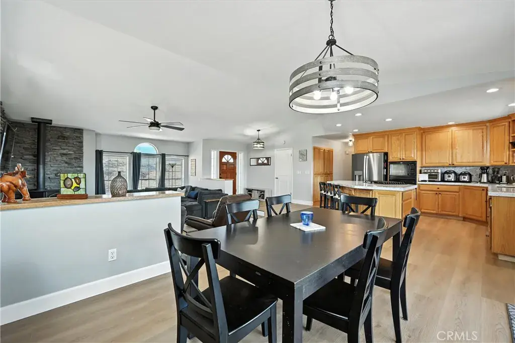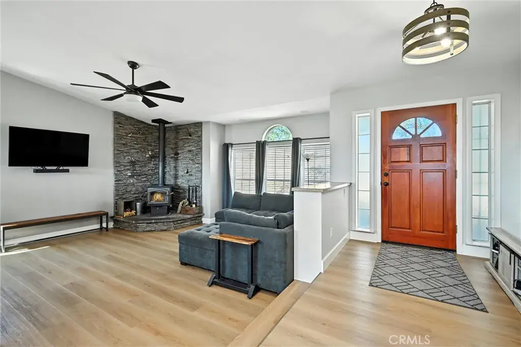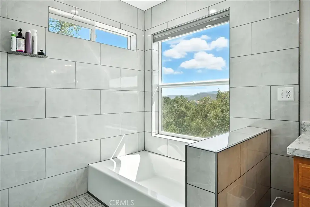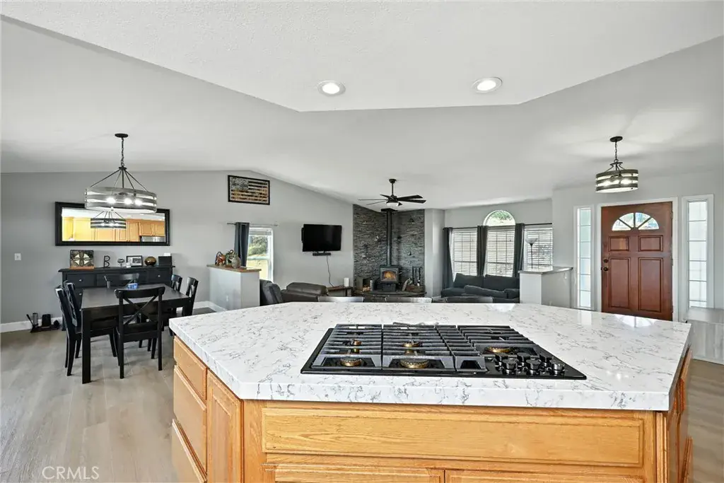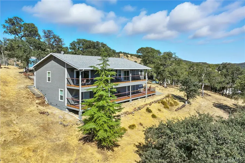 Expansive Rancho Retreat with Sweeping Views & Modern Upgrades! Set on over 5+ acres in the desirable HVL Ranchos—with no HOA dues!—this beautifully remodeled home showcases unobstructed views of the valley, Mt. St. Helena, and the Hidden Valley Lake golf course pond. With modern upgrades, thoughtful design, and versatile spaces, it’s a home that blends elegance with everyday comfort. The open great room flows into a step-down living area anchored by a wood-burning fireplace with custom stone surround. The chef’s kitchen features abundant wood cabinetry, quartz countertops, built-in oven and microwave, five-burner cooktop, and breathtaking views framed by the kitchen window. Luxury vinyl plank flooring extends throughout the home, complemented by brand-new carpet on the staircase. Just down the hall are two bedrooms and two remodeled baths. The hall bath offers dual sinks, granite slab counters, upgraded cabinetry with linen storage, and a large tub/shower combo. The primary suite is a spa-like retreat with radiant flooring, soaking tub beneath a panoramic window, oversized custom tile shower with specialty coated glass, privacy water closet, quartz dual-sink vanity, updated lighting, and a massive walk-in closet. Also upstairs, the versatile utility room doubles as an office and laundry area with storage closets, utility sink, and breezeway access to the oversized 2-car garage with workshop. Downstairs are two additional rooms: a third bedroom with en suite bath and private deck access, plus a bonus room that is an entertainer’s dream complete with custom bar, sink, cabinetry, and slider to the back deck. Both levels open to full-length covered decks, offering seamless indoor/outdoor living and panoramic vistas. In addition to the two-car garage plus workshop, there are two attached carports, a detached RV carport, animal pens, garden areas, and plenty of space for livestock, orchards, or future expansion. Additional upgrades include an attic fan that circulates woodstove heat, a water softener, a generator at the well, and more. A rare combination of elegance, versatility, and wide-open views—this Rancho retreat is truly one of a kind!