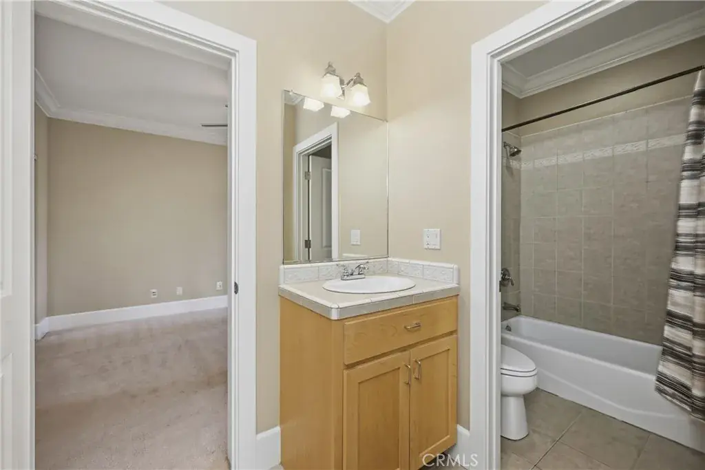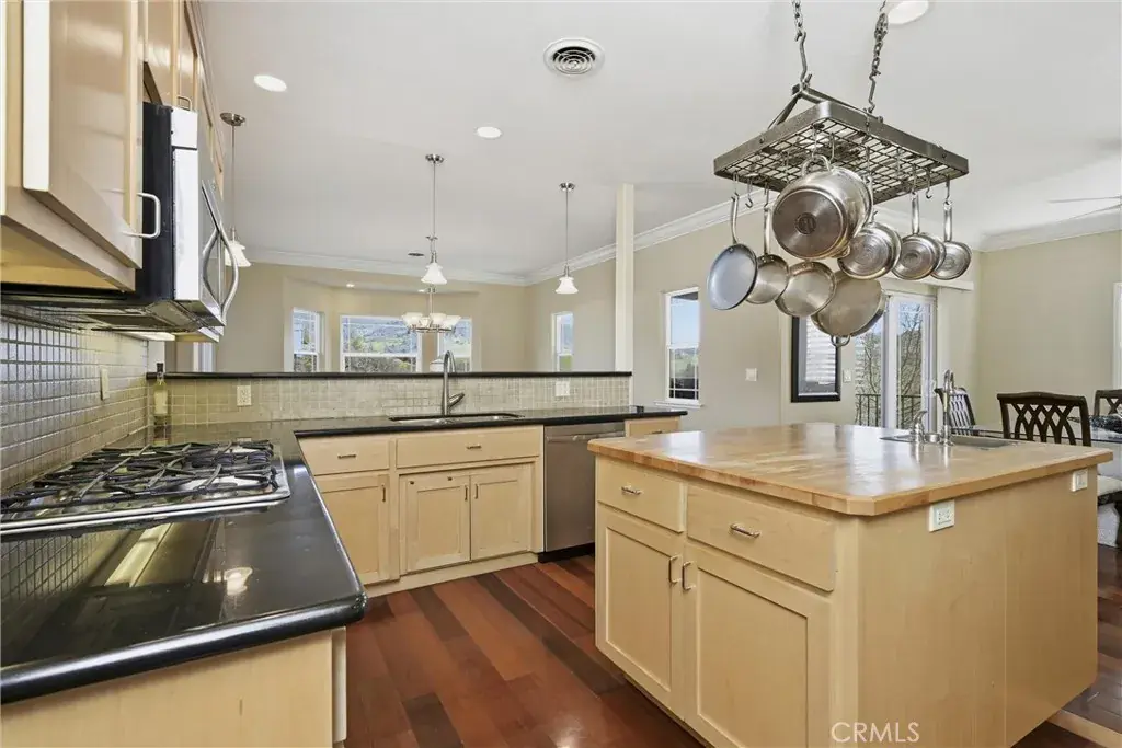 The gourmet kitchen is a chef’s dream, complete with stainless steel appliances, granite countertops, abundant cabinetry, and a large pantry. The open layout flows seamlessly into the dining and living areas, ideal for hosting gatherings.