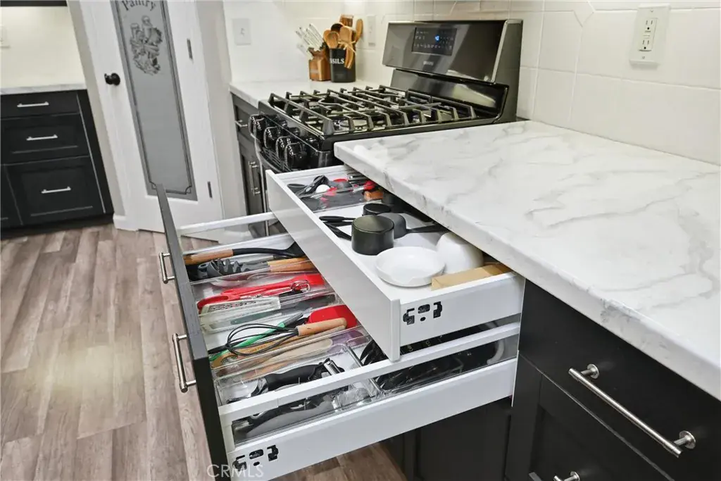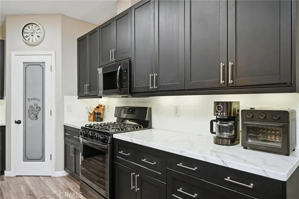 Tucked away on a quiet court in the gated community of Hidden Valley Lake near serene Putah Creek, this spacious single-level 4-bedroom, 3-bath home offers comfort, privacy, and thoughtful upgrades throughout. A charming four-tier fountain welcomes you at the front, setting a peaceful tone as you step inside. The heart of the home is the beautifully remodeled kitchen (2020), featuring new cabinetry, all newer appliances, a large quartz island with a pull-out garbage drawer, and three oversized cabinets on the opposite side for exceptional storage. Drawer-within-a-drawer cabinetry maximizes efficiency, while a walk-in pantry provides even more space. The kitchen opens to the family room, where a cozy wood-burning fireplace with propane start creates a warm gathering space.