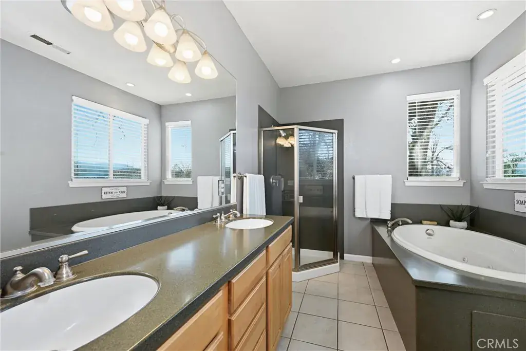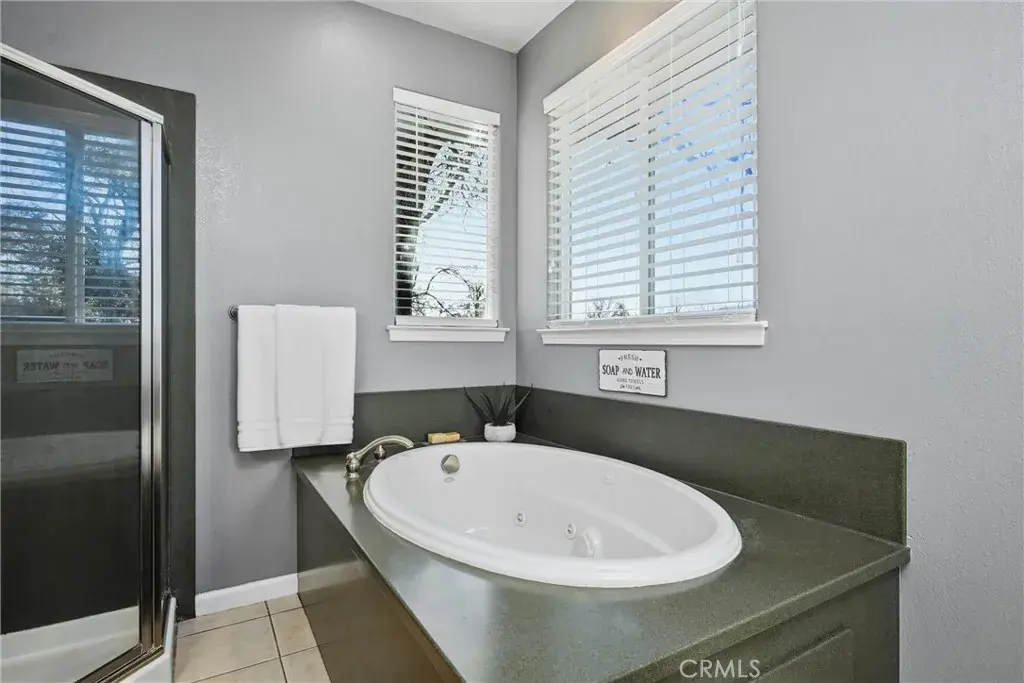 The primary suite is a relaxing retreat with direct access to the back porch, a generous walk-in closet, and a well-appointed ensuite bathroom offering dual sinks, Corian counters, a jetted soaking tub, and a separate shower. The second bedroom features a private entrance to the front porch, a large closet with a modular, customizable shelving system, and access to a Jack-and-Jill bathroom shared with the third bedroom, which includes a standard-sized closet and its own convenient bathroom access. The fourth bedroom also opens directly to the back porch and includes a closet, making it ideal for guests, a home office, or flexible living needs.