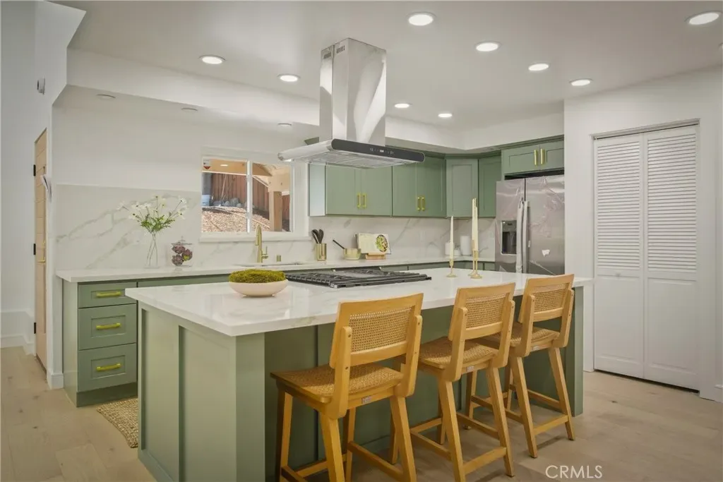 Step inside to soaring ceilings and a bright, open floor plan filled with natural light. At the center of the home, the chef’s kitchen features sleek cabinetry, updated countertops, premium appliances, and a spacious island designed for both daily living and easy entertaining. The open connection between the living, dining, and outdoor spaces creates a home that lives beautifully.