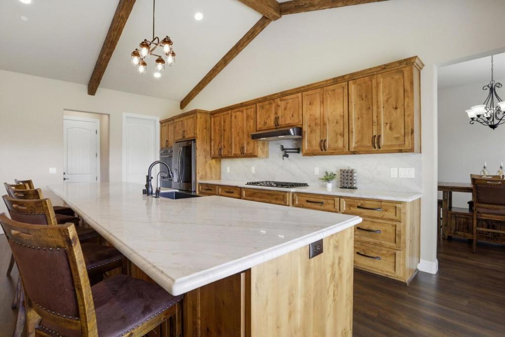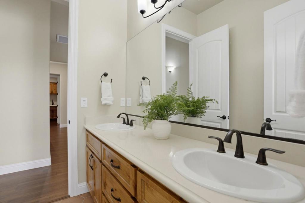 Beautiful 2,536 sq. ft. 4 bed, 3 bath home on a 10,032 sq. ft. lot backing to a peaceful drainage pond with no rear neighbors, offering privacy and open views. Wood laminate flooring throughout the main living areas. The gourmet kitchen features quartz countertops and backsplash, pot filler, 5-burner gas cooktop, dual ovens, stainless steel appliances, and an oversized island with farmhouse sink ideal for entertaining and an open floor plan lifestyle. Abundant cabinetry with under-cabinet d upper accent lighting. Formal dining room with custom-built-ins and glass display cabinets. Living room features vaulted open-beam ceilings and a stone gas fireplace. Estate shutters throughout. Spacious primary suite with backyard access and a luxurious bathroom including a stone walk-in shower with three shower heads. Low-maintenance backyard with artificial turf and stamped concrete patio, perfect for outdoor living. Smart home includes fire sprinklers, reverse osmosis and whole-house water filtration. Finished 3 car garage with ample storage and room for golf cart parking.