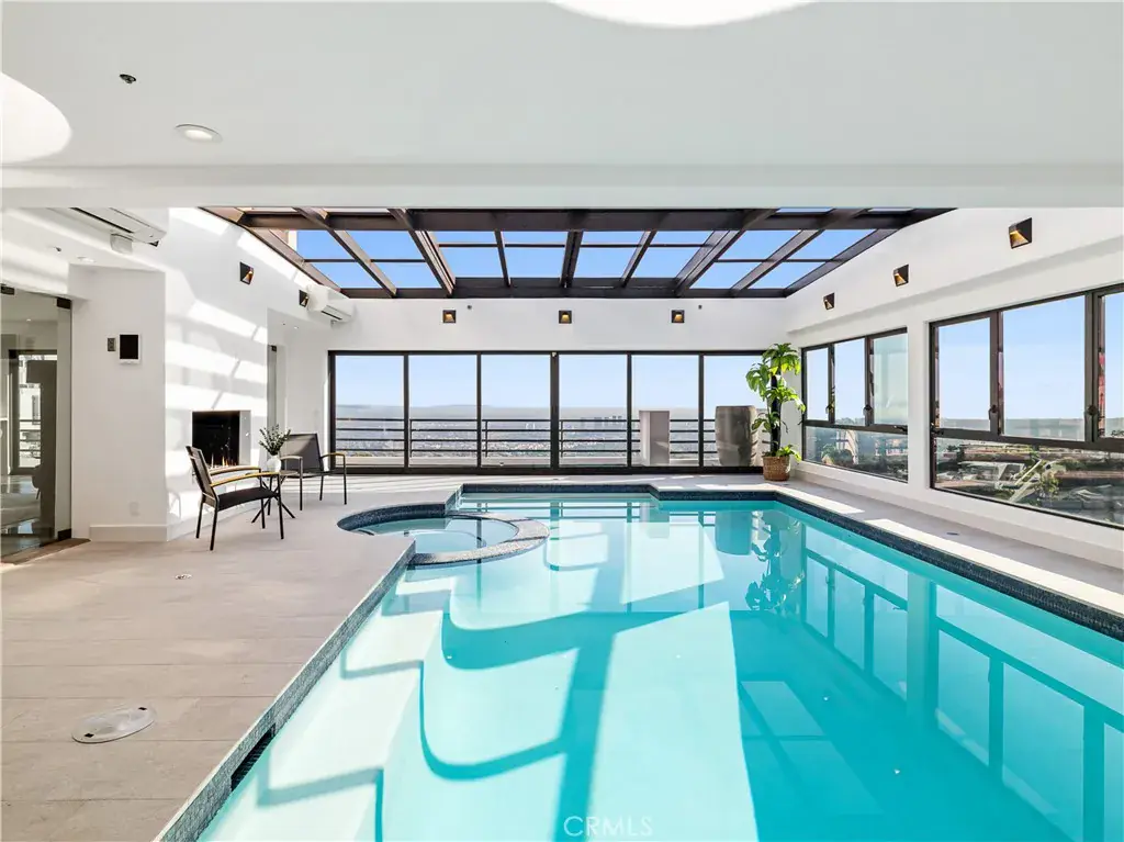 An open floor plan with floor to ceiling windows seamlessly connects the main living areas, where you’ll find two spacious lounges, a modern kitchen with a breakfast bar, and a unique indoor/outdoor heated pool. The pool is designed for year-round enjoyment, featuring a retractable glass roof and fully opening floor-to-ceiling windows that seamlessly blends indoor and outdoor living.