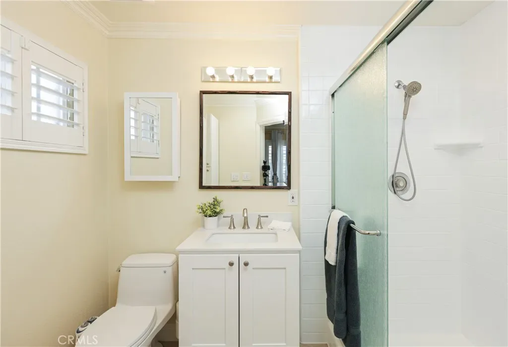 The spacious primary suite includes an en-suite bathroom with a large walk-in shower, creating a serene private retreat.